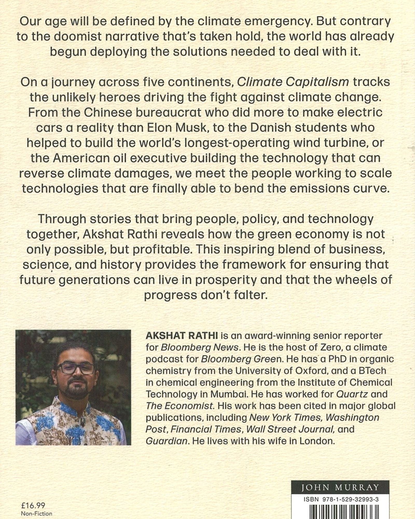 في رحلة عبر خمس قارات، يتتبع كتاب "رأسمالية المناخ" أبطالًا غير متوقعين يقودون معركة مكافحة تغير المناخ. بدءًا من المسؤول الصيني الذي بذل جهودًا أكبر من إيلون ماسك لجعل السيارات الكهربائية واقعًا ملموسًا، وصولًا إلى الطلاب الدنماركيين الذين ساعدوا في بناء أطول توربين رياح في العالم، وصولًا إلى المدير التنفيذي لشركة نفط أمريكية يطور تقنيةً قادرة على عكس آثار تغير المناخ، نلتقي بأشخاص يعملون على توسيع نطاق التقنيات التي تُمكّن أخيرًا من تغيير منحنى الانبعاثات.