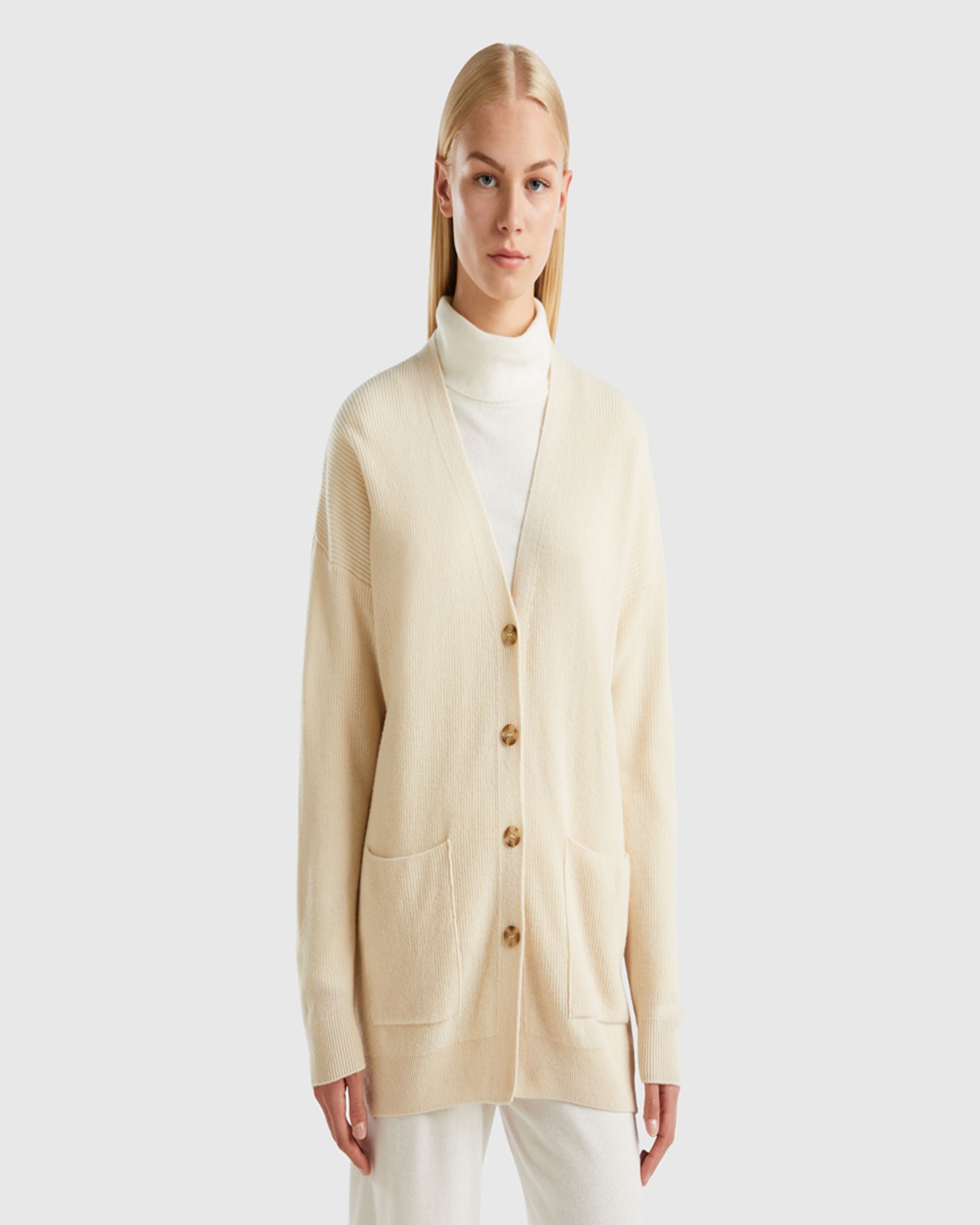 Long sleeve cardigan in soft wool and viscose blend fabric. Wide fit, V-neck and front opening with buttons. Ribbed detail on the bottom and front patch pockets. Perfect for overlays.