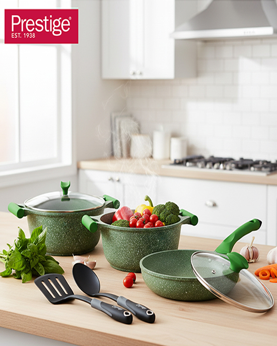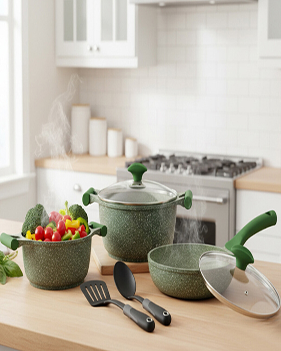 •Prestige Essentials 7 pc set Green Granite Non-Stick Cast Aluminium