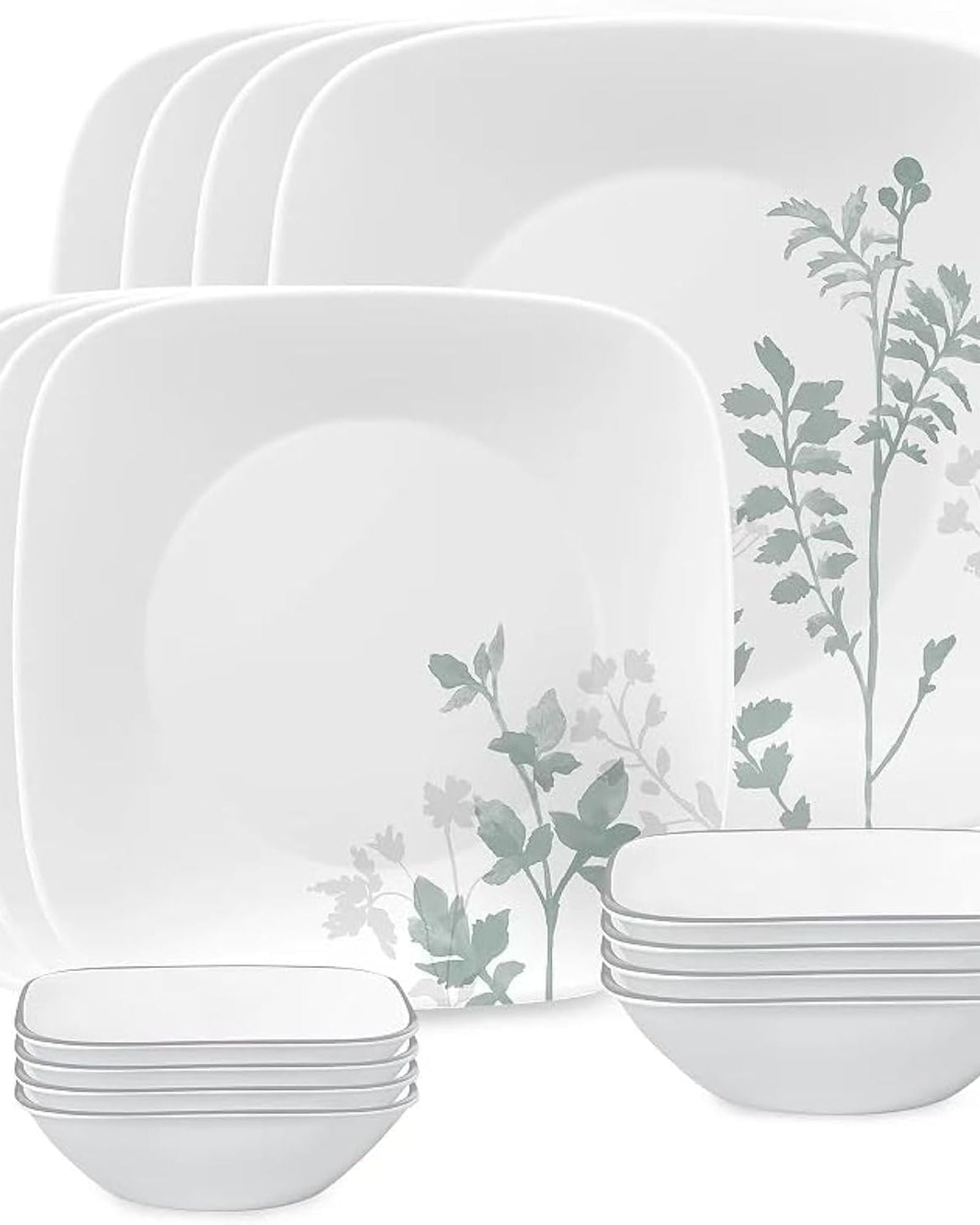 Corelle 16-Piece Square Amalie Dinnerware Set, Service for 4, (1148617) - The hand-sketched stems bring to mind carefully pressed florals from a delicate bouquet. These dishes will create a picture-perfect canvas for both relaxed and formal table settings. Extra strength Vitrelle: our unique, triple layer glass technology stands the test of time Eco-friendly: made from up to 80% pre consumer recycled glass Durable & Versatile: dishwasher, microwave, freezer and pre-heated oven (to 350° F) safe Space saving design: sleek, super lightweight and ultra-stackable plates and bowls Made in the USA: Corelle Vitrelle glass is Crafted with pride in Corning, NY since 1970