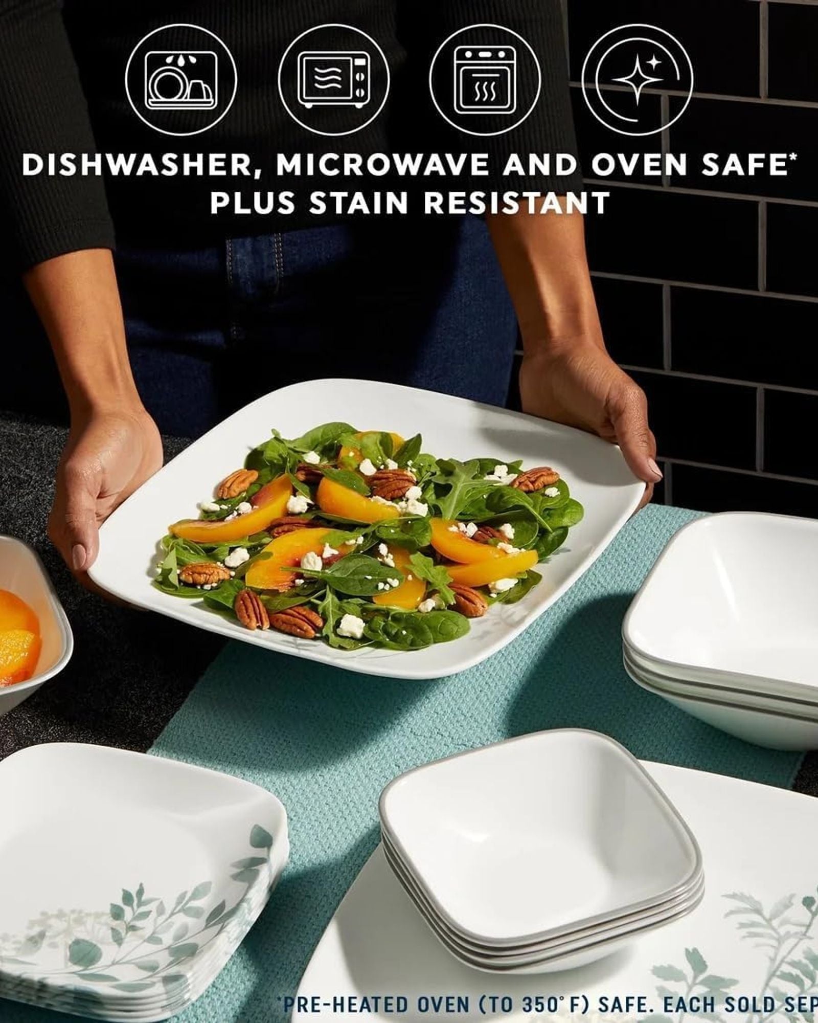 | Extra strength Vitrelle: our unique, triple layer glass technology stands the test of time Eco-friendly: made from up to 80% pre consumer recycled glass Durable & Versatile: dishwasher, microwave, freezer and pre-heated oven (to 350° F) safe Space saving design: sleek, super lightweight and ultra-stackable plates and bowls Made in the USA: Corelle Vitrelle glass is Crafted with pride in Corning, NY since 1970 |
