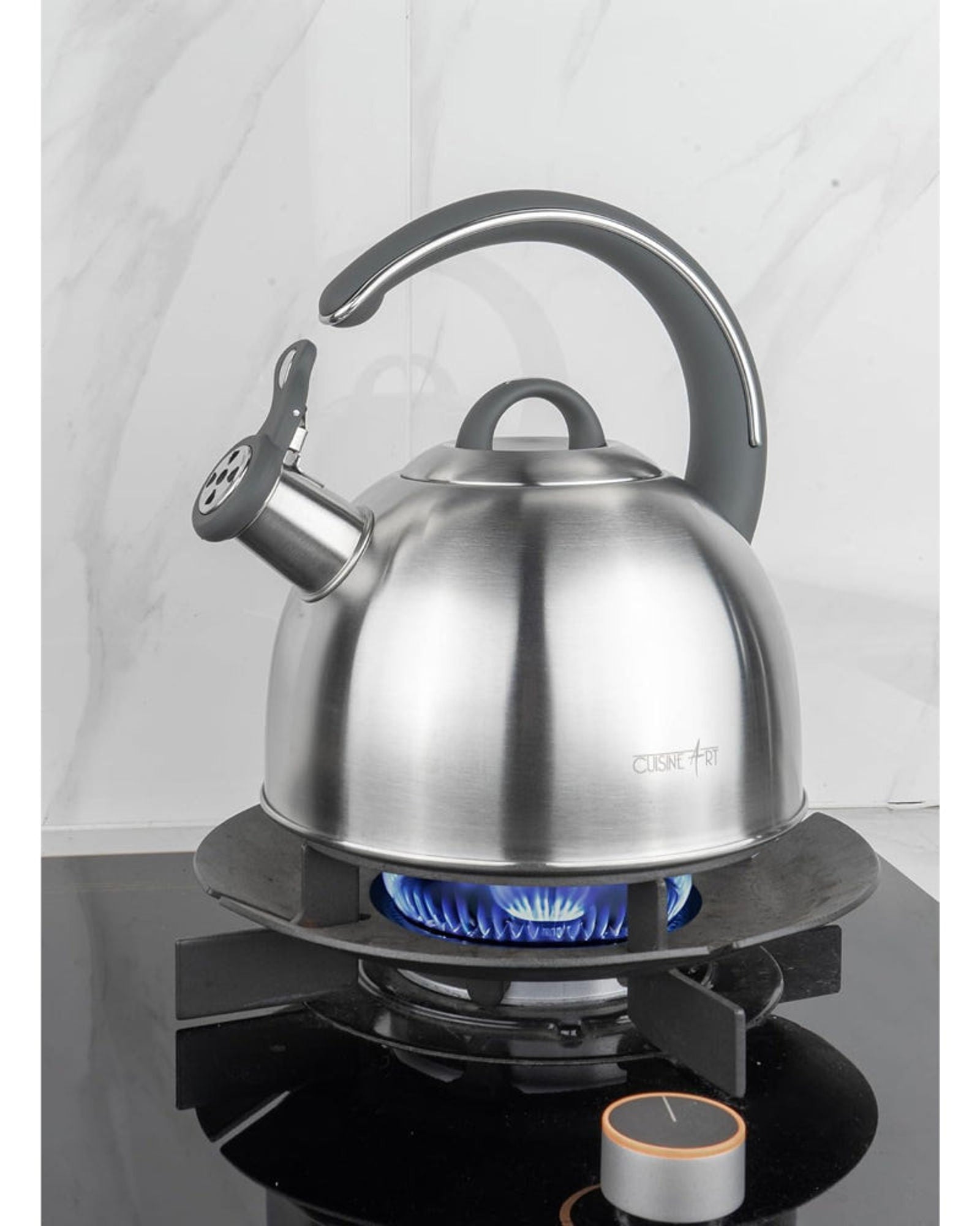 Introducing the Cuisine Art KAHL Stainless Steel Whistling Tea Kettle, a perfect combination of style, efficiency, and durability. With a 3.0L capacity, this large kettle is ideal for preparing hot beverages for family gatherings, friends, or personal use. Its durable 201 stainless steel body ensures rust resistance and long-term durability, while the advanced capsule bottom is engineered for fast, even heat distribution. This multi-layer bottom includes stainless steel, aluminum, and iron layers for optimal boiling efficiency. The fixed stainless steel and nylon handle and knob are designed for comfort and safety, featuring a grey soft-touch coating. This ergonomic design ensures secure handling, even when the kettle is hot. The sleek satin finish on both the inside and outside of the kettle makes it easy to clean, while also giving your kitchen a modern touch. When the water is ready, the kettle’s whistle will alert you, ensuring safe and convenient use. The Cuisine Art KAHL Whistling Tea Kettle brings functionality, style, and durability to your kitchen.