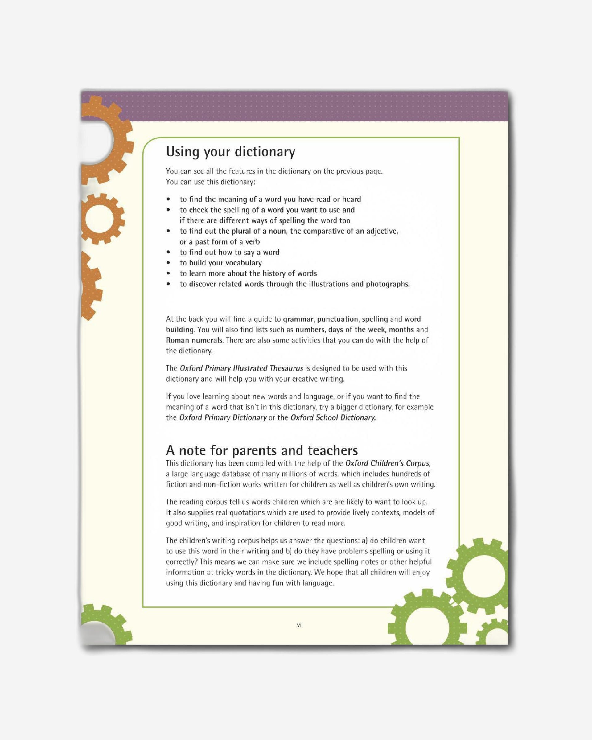 Examples taken from well-known children's books and a supplement of days, months, spelling, apostrophes and word building help makes improving vocabulary fun. This dictionary is part of a set of Oxford Primary Illustrated reference titles which include a companion thesaurus, a maths dictionary, science dictionary and computing dictionary. Looking for great word activities to match this dictionary? Find fun downloadable activities, puzzles, and word games at www.oxforddictionaries.com/schools