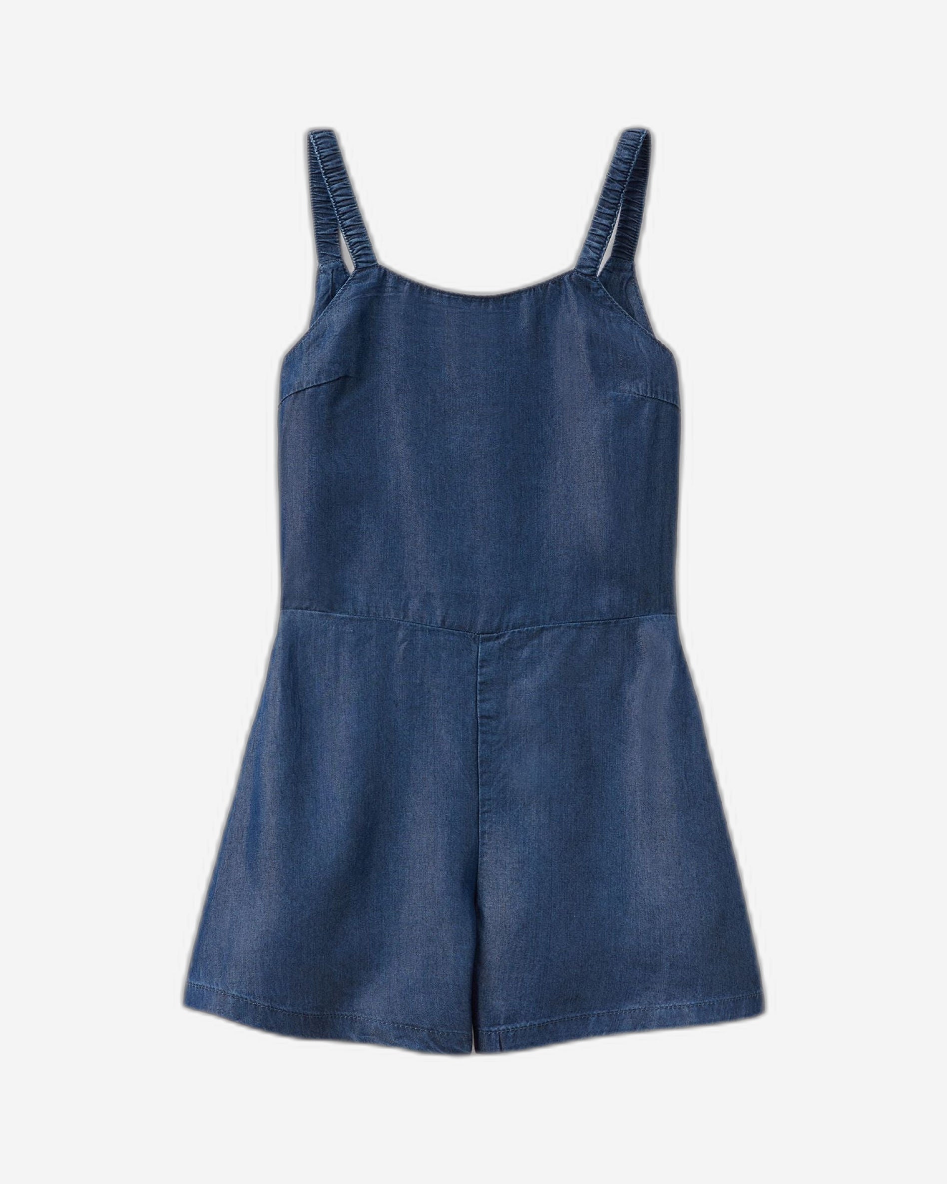 Sleeveless short jumpsuit in Tencel™ denim with a relaxed leg. Square neck and thin shoulder straps. Back opening with buttons. For original and super feminine looks.