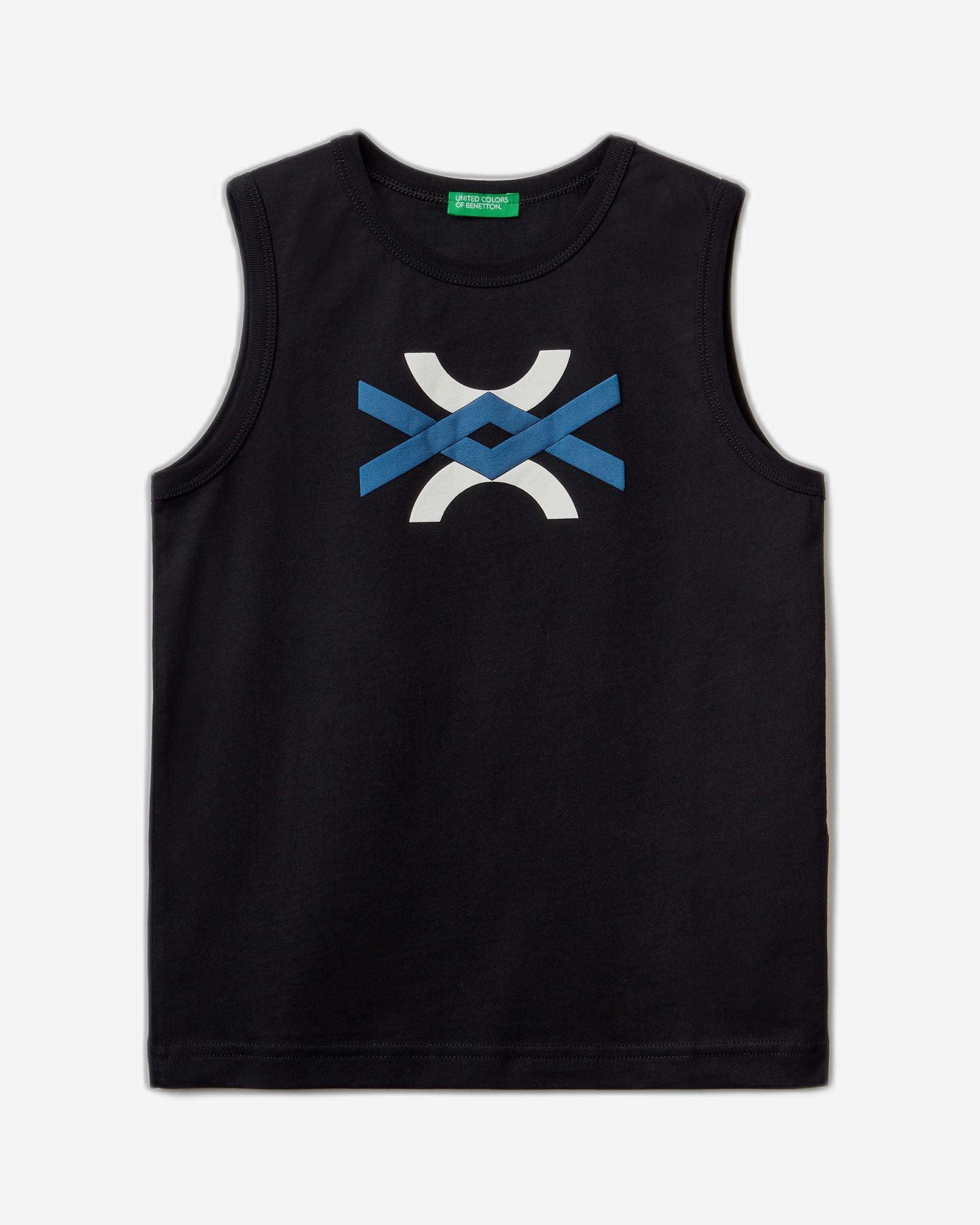 Sleeveless crew neck t-shirt in pure organic cotton. Front print with embossed logo graphic. Lightweight and comfortable, perfect for warmer days.