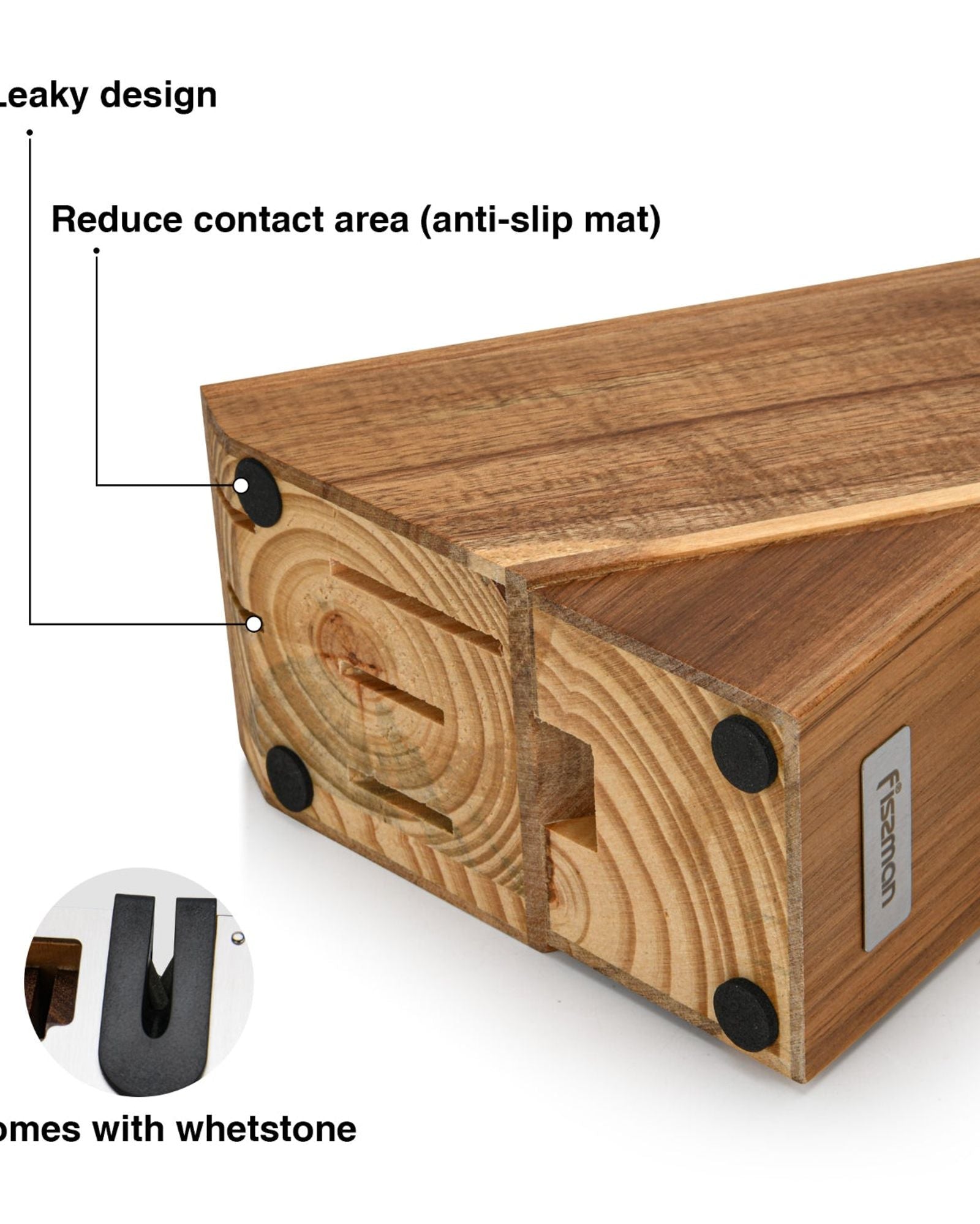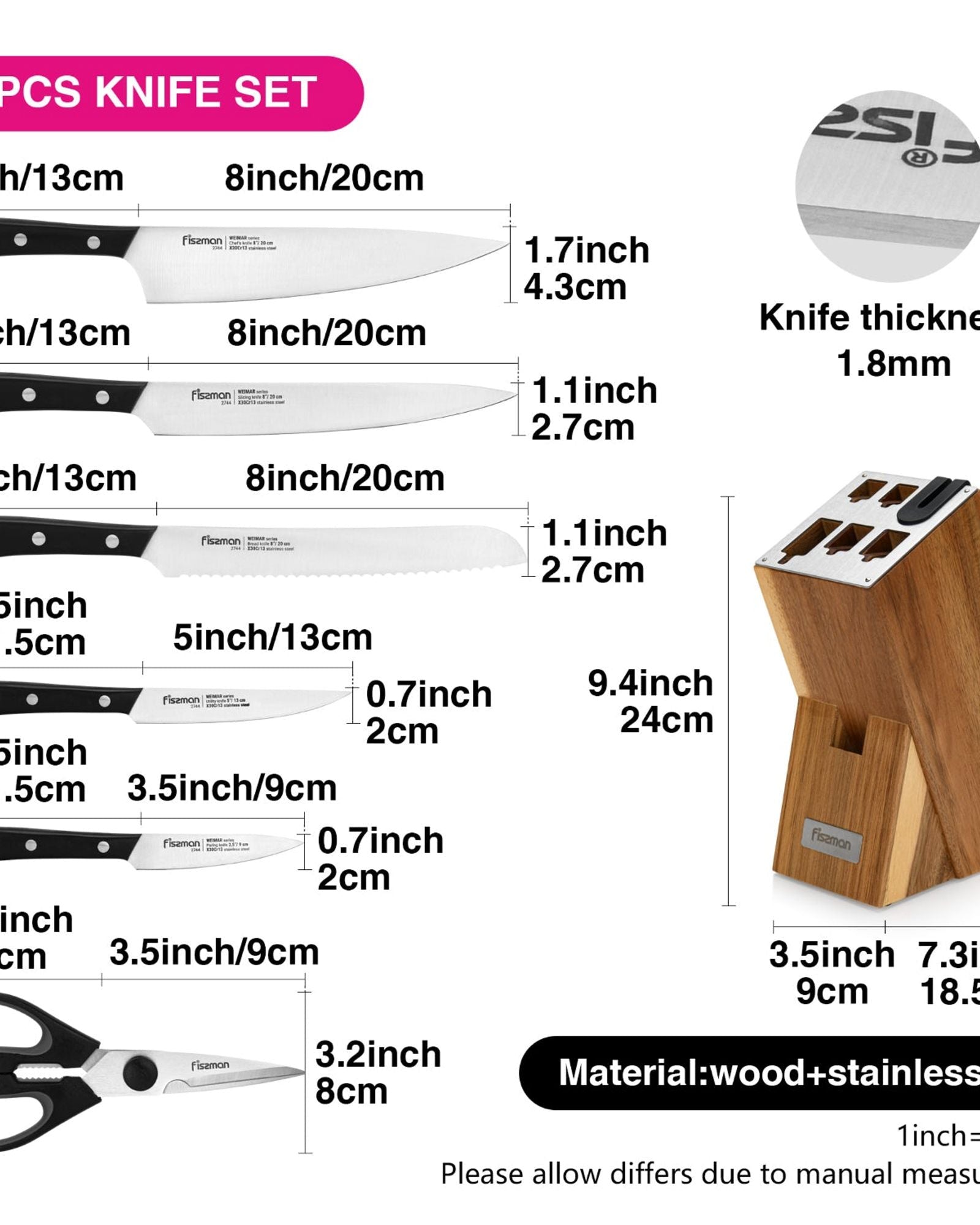 * Innovative Wood Stand Design: The stand, crafted from solid acacia wood in a natural color, combines classic design with innovation. It seamlessly fits into the kitchen interior, ensures safe storage, and saves space. The built-in sharpener with diamond stones maintains knife sharpness, providing convenience for users.
