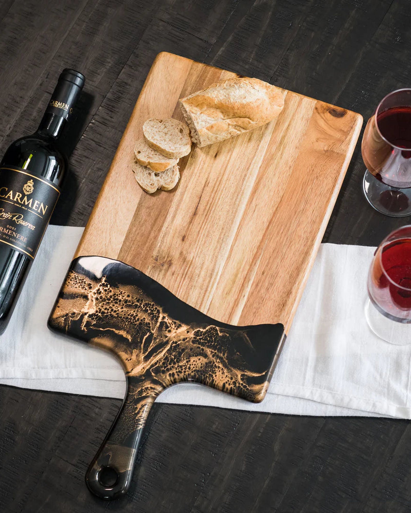 These pieces blend gorgeous Acacia hardwood and an eco-friendly resin to create a one-of-a-kind piece of serveware for your home. These cheese boards are perfect for serving a group of 4-6 people.