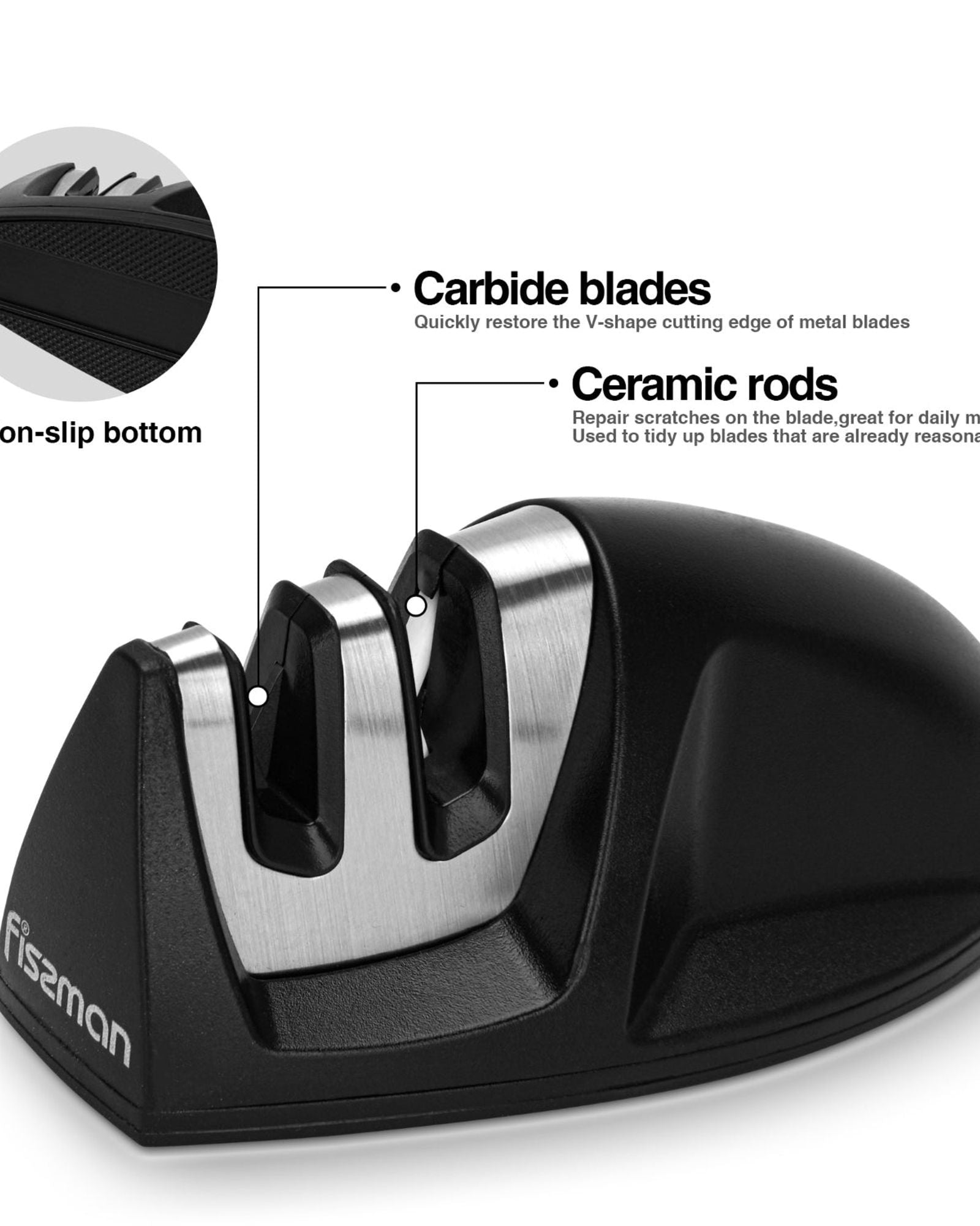 Two-step sharpener for rough sharpening and fine sharpening with tungsten carbide and ceramic stones. The fixed angle of the stones allows you to achieve high-quality sharpening, and the silicone base prevents slipping. All knives are specially selected to perform a wide variety of tasks