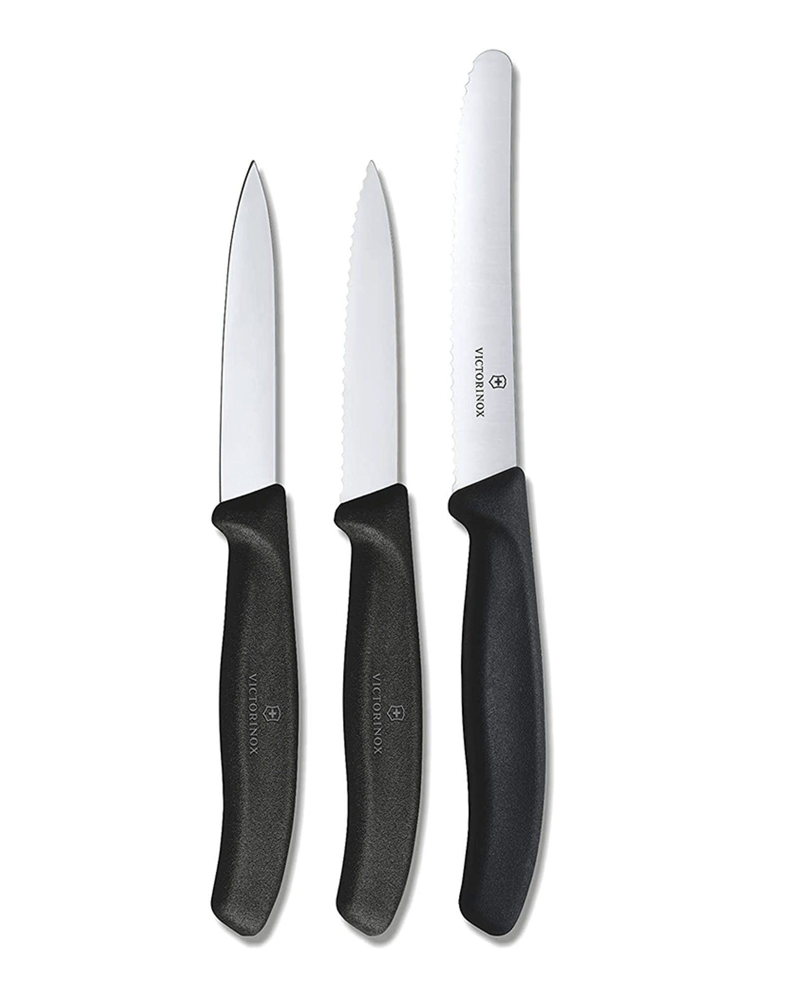 Victorinox Swiss Classic 3 Paring Knives with three types of blades and highly ergonomic black handles. Optimal combination of paring knives for super versatile usage. Our paring knife set, a super hardworking trio to cover all slicing, peeling and coring bases. This dexterous little collection contains two wavy-edged blades for a stack of fruit and one straight edge for smaller citrus fruits and green veg. Set includes 1 x Straight Edge 8 cm length. 1 x Wavy Edge 8 cm length. 1 x Round Tip and Wavy Edge 11 cm length.