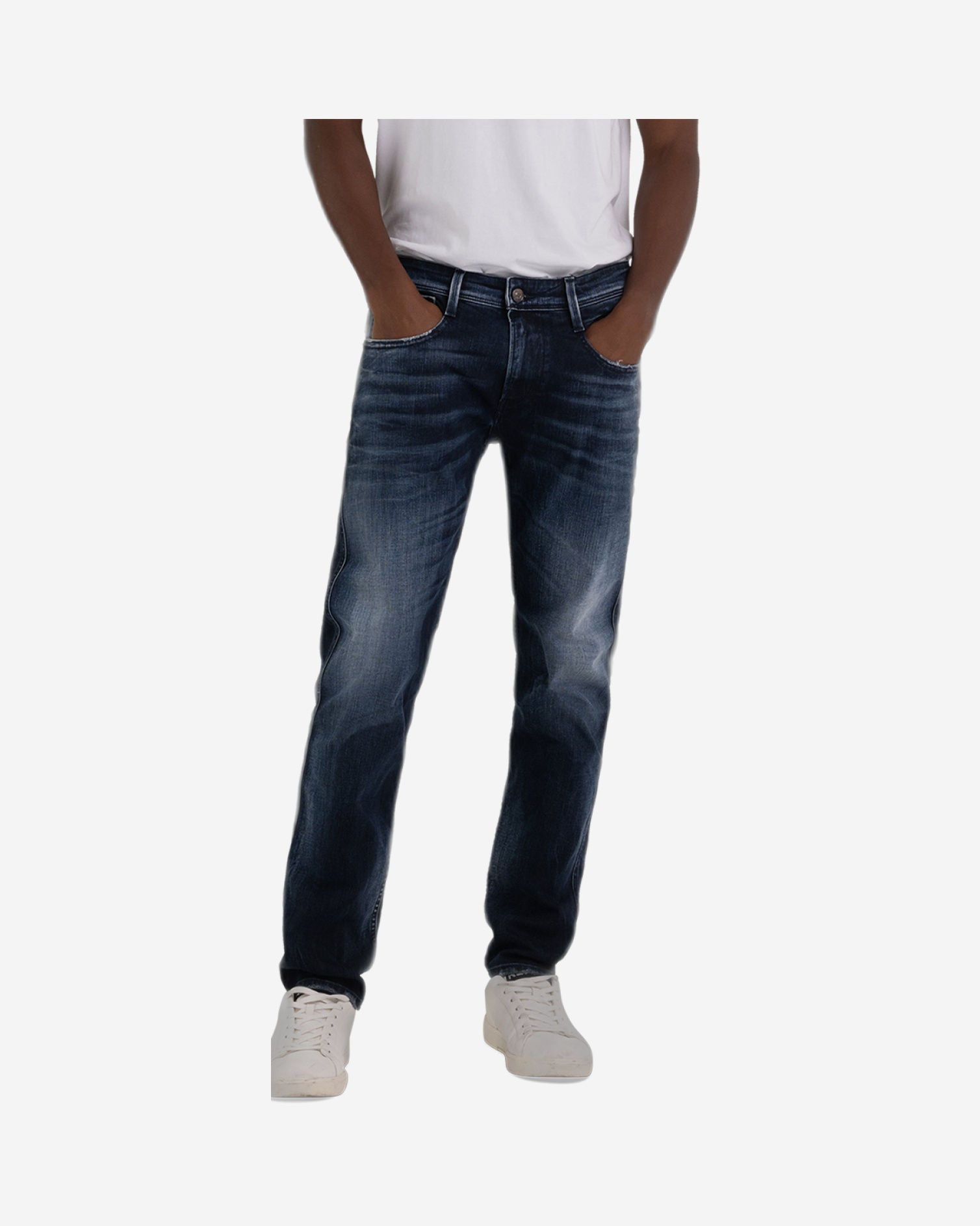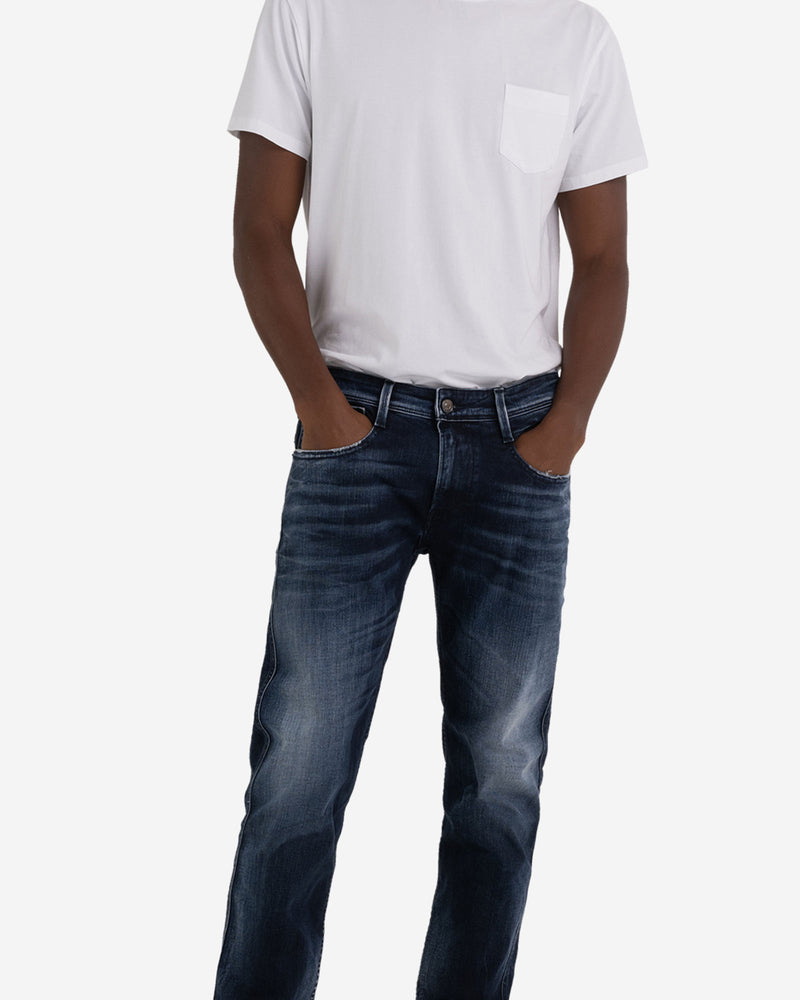 SLIM FIT ANBASS JEANS WITH REGULAR FIT AND TAPERED LEG FOR A COMFORT FIT. WITH AN AUTHENTIC LOOK, THE GARMENT IS MADE OF 10,5 OZ 100% SUSTAINABLE BLUE OVERDYED BLACK STRETCH DENIM WITH A MEDIUM DARK STONEWASHED WASH TONE. THE FIVE POCKET ITEM WITH ABRASIONS ON THE EDGES AND AT THE HEM IS CHARACTERIZED BY THE HANDMADE SCRAPINGS WHICH CREATES CONTRASTING COLOURS ON USED AREAS. ZIP AND BUTTON FLY