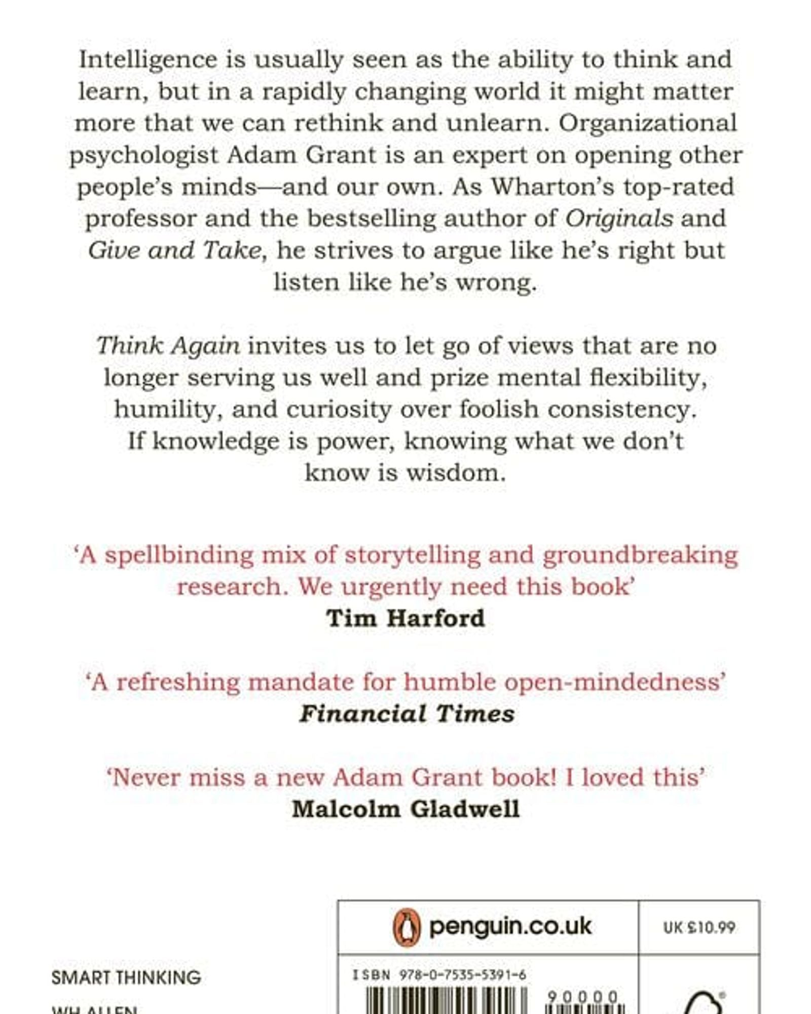 Told through fascinating stories, informed by cutting-edge research and illustrated with amazing insights from Adam Grant's conversations with people such as Elon Musk, Hilary Clinton's campaign team, top CEOs and leading scientists, this is the ultimate guide to keeping your thinking fresh, learning when to question your ideas and update your own opinions, and how to inspire those around you to do the same.