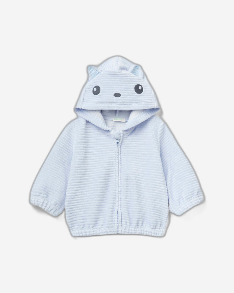 Long sleeve sweatshirt in soft stretch cotton blend chenille. Equipped with a hood with embroidered animal face and small ears applied. Convenient opening with zipper and safety zip guard. Comfortable, versatile and witty.