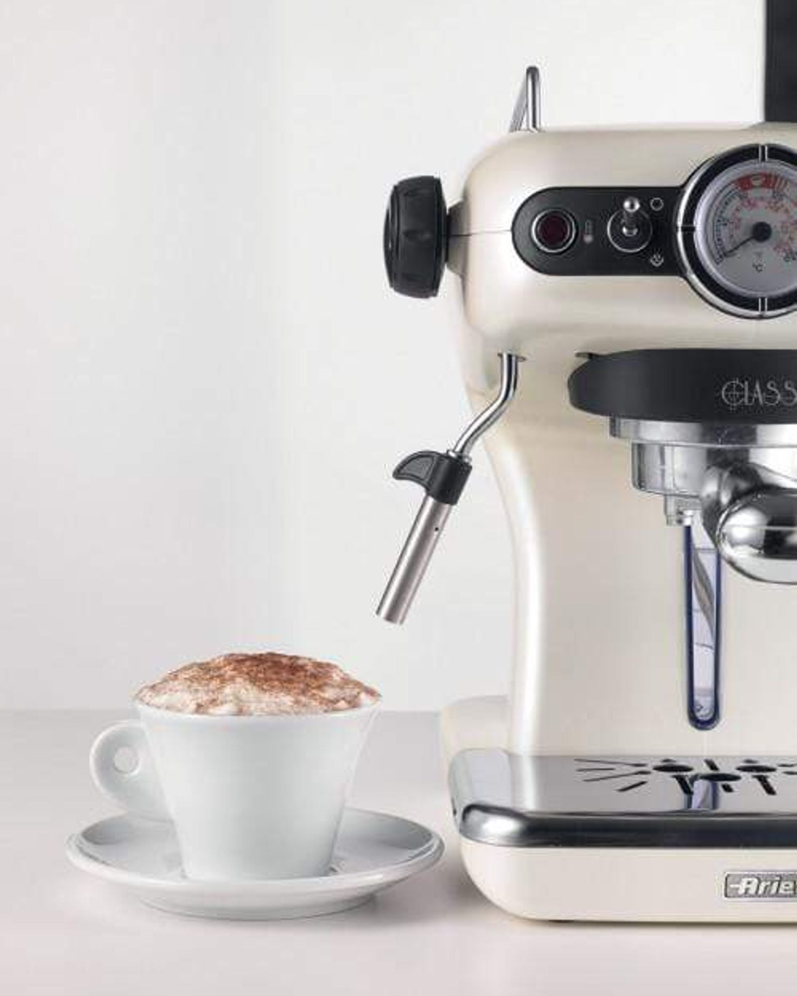 Ariete Classica Pump Espresso Machine, Pearl 1389A From its experience and research activity, Ariete has created the new Classic Range. This new range of exclusive and valuable products is the result of a successful combination of design, elegance, efficiency and high-quality. The Classical range, with its timeless style, perfectly suits any domestic environment and satisfies the most refined tastes. The Classic Range products are available in 3 colors: Bronze, Copper and Pearl-white, which both suit classical and modern environments, adding a touch of style to your kitchen. The Espresso machine, also ideal for cappuccino coffees, with its style enriched by metallic finishes, is designed to be the essential accessory for you kitchen. The filter holder is compatible with both E.S.E. coffee pods and powder, for 1 or 2 cups.