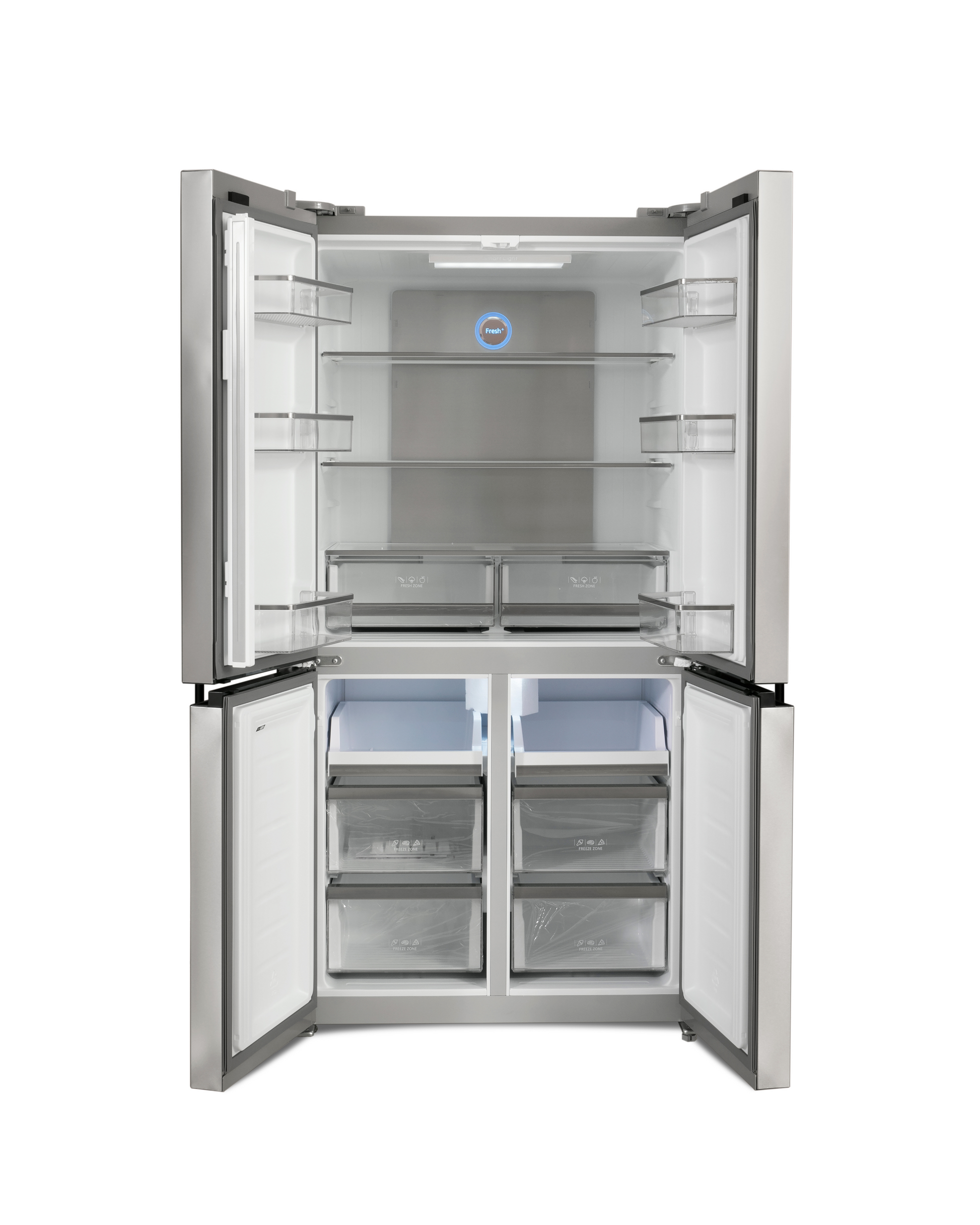 DESIGN ELEMENTS: Sleek cross-door configuration with integrated handles and silver finish, complemented by metal cooling panels for optimal performance.
