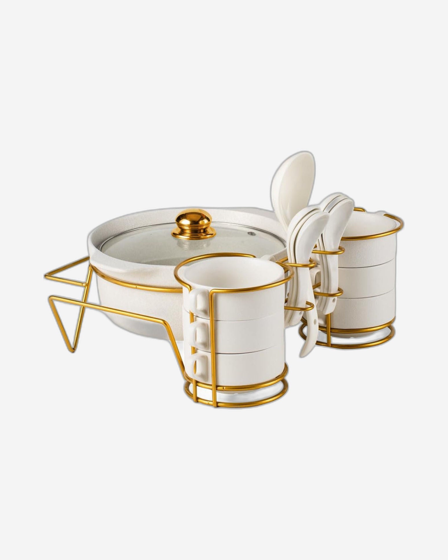 * Versatile 16-Piece Set: Includes bowls, spoons, and a coordinated gold stand rack for a comprehensive and sophisticated soup-serving solution.