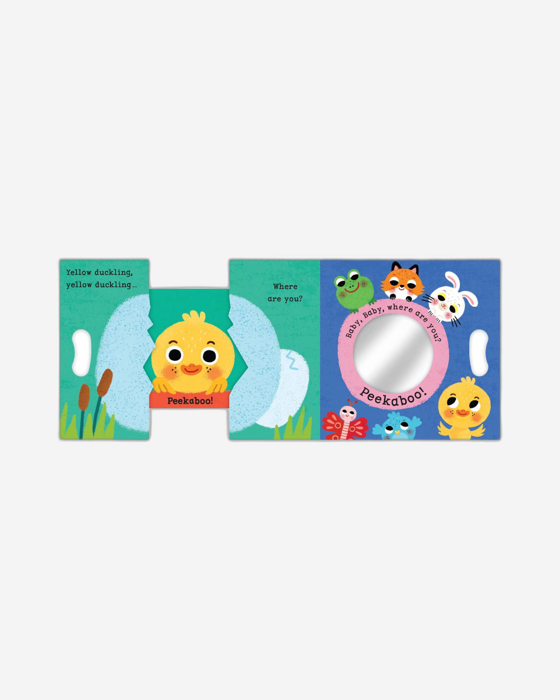 In Duckling, Duckling, PEEKABOO, babies' favourite game is brought to life with easy grab-and-pull mechanisms and a shiny mirror.