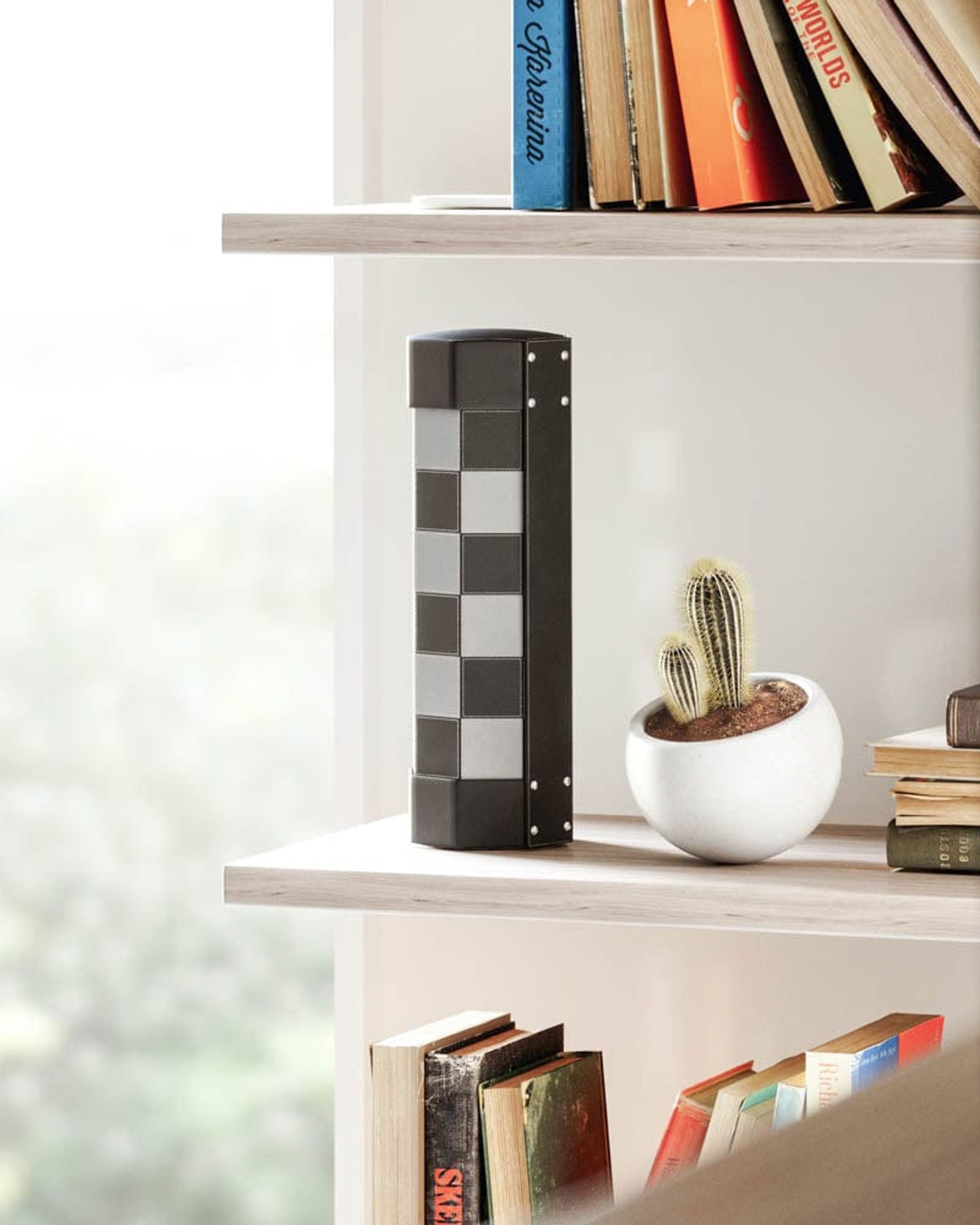 A fun game for on the go or at home, Rolz is a portable chess and checkers set. Easily rolling up, Rolz keeps all the set pieces together in one place for compact storage. With resin checker pieces and silk-screened chess characters, Rolz can be used by chess and/or checker lovers. Bring the game on the go with Rolzs' integrated storage holder and strap. Durable and with a modern black and white stitched design, Rolz is made of a wooden base and vegan leather. Measures 12 x 12 x 1" (30 x 30 x 3 cm)