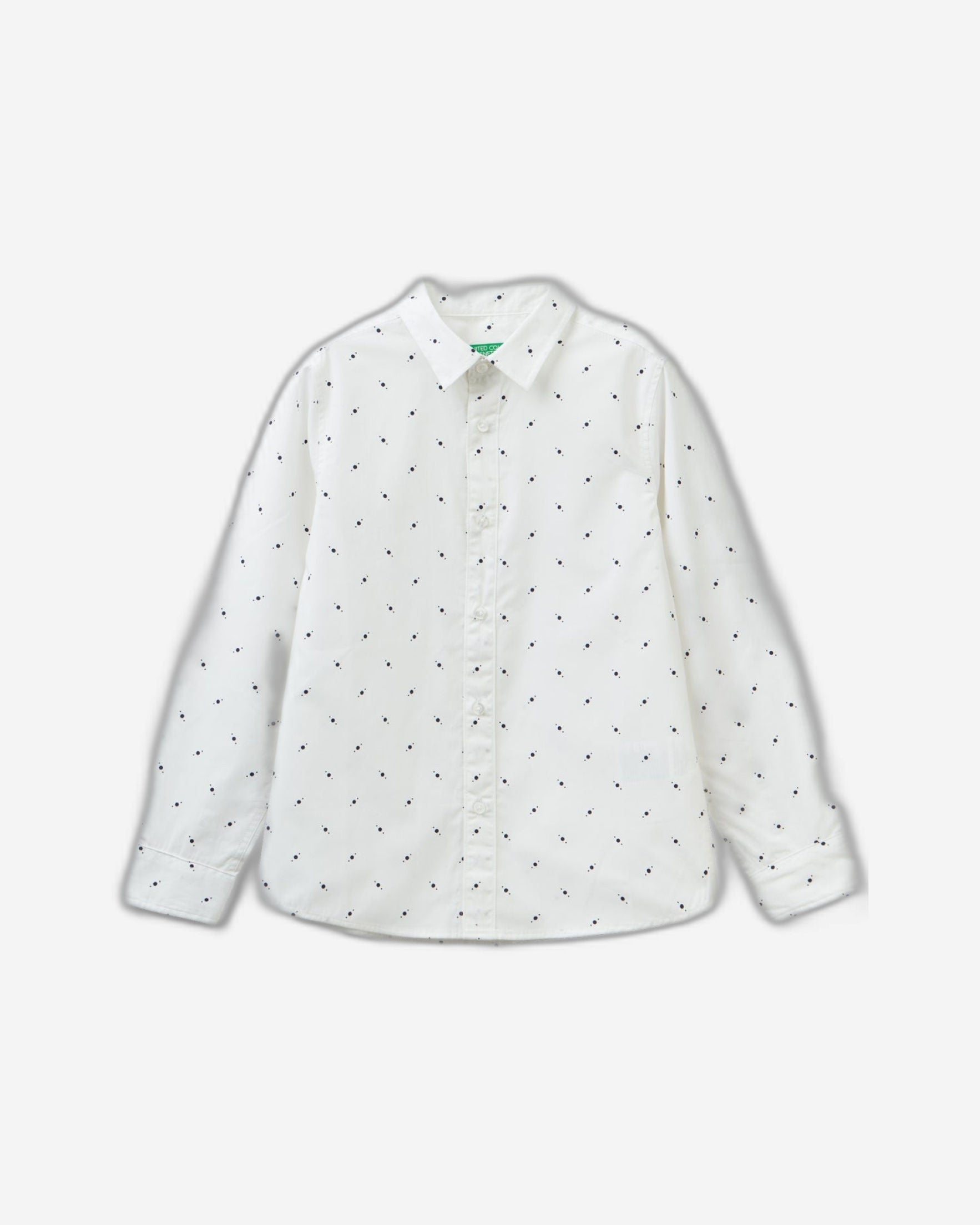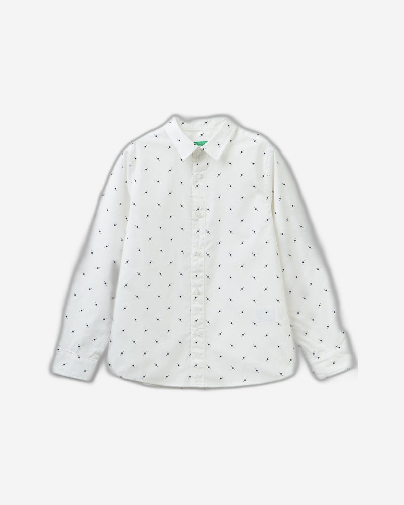 100% cotton poplin; Cuff with button; Rounded bottom; Yoke at back; Allover print