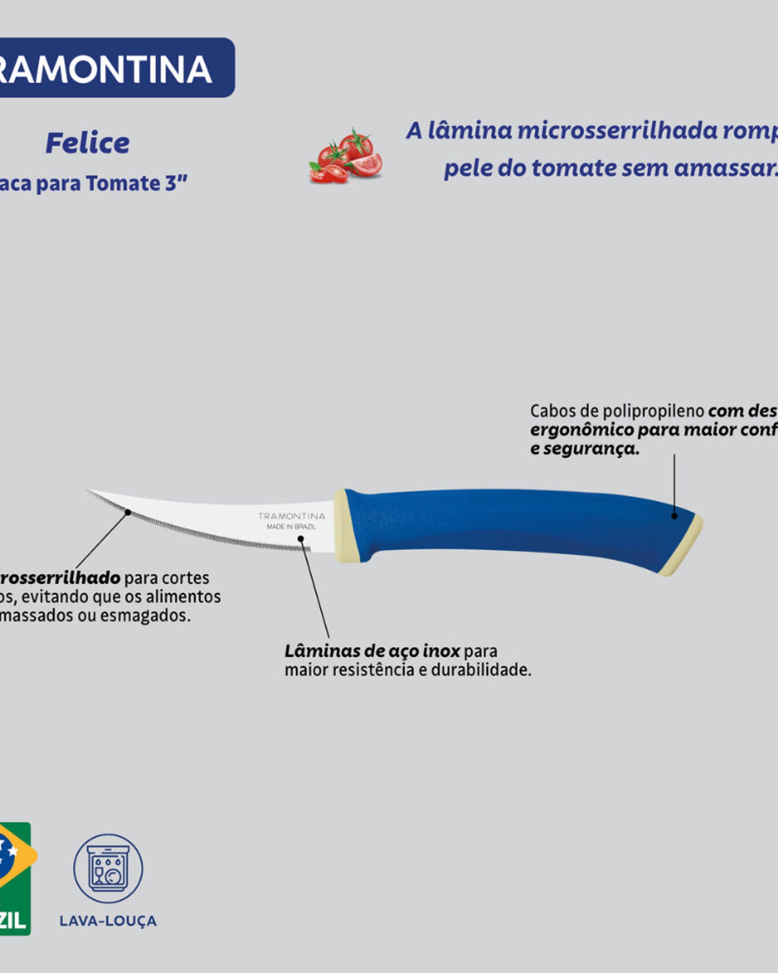 The Tramontina Felice 2-piece tomato knife set with stainless-steel blades and blue polypropylene handles is the perfect choice to preserve all the characteristics of delicate foods when it comes to removing their skin, cutting, chopping or slicing. Manufactured with stainless-steel blades and polypropylene handles, these knives have excellent cutting power, high strength, durability, and a much more comfortable handling. In addition to all these features, the knives are very easy to clean and dishwasher-safe also, to make your tasks in the kitchen even easier!