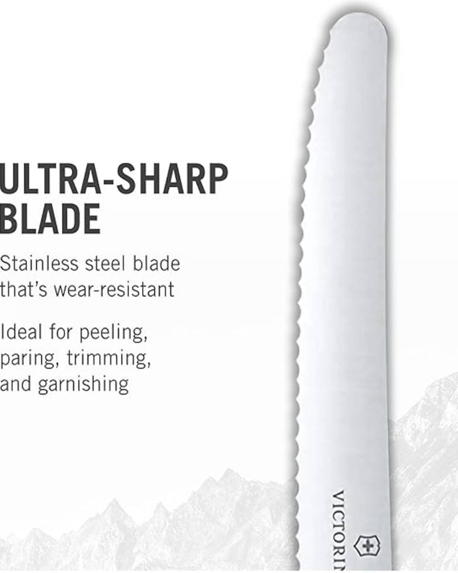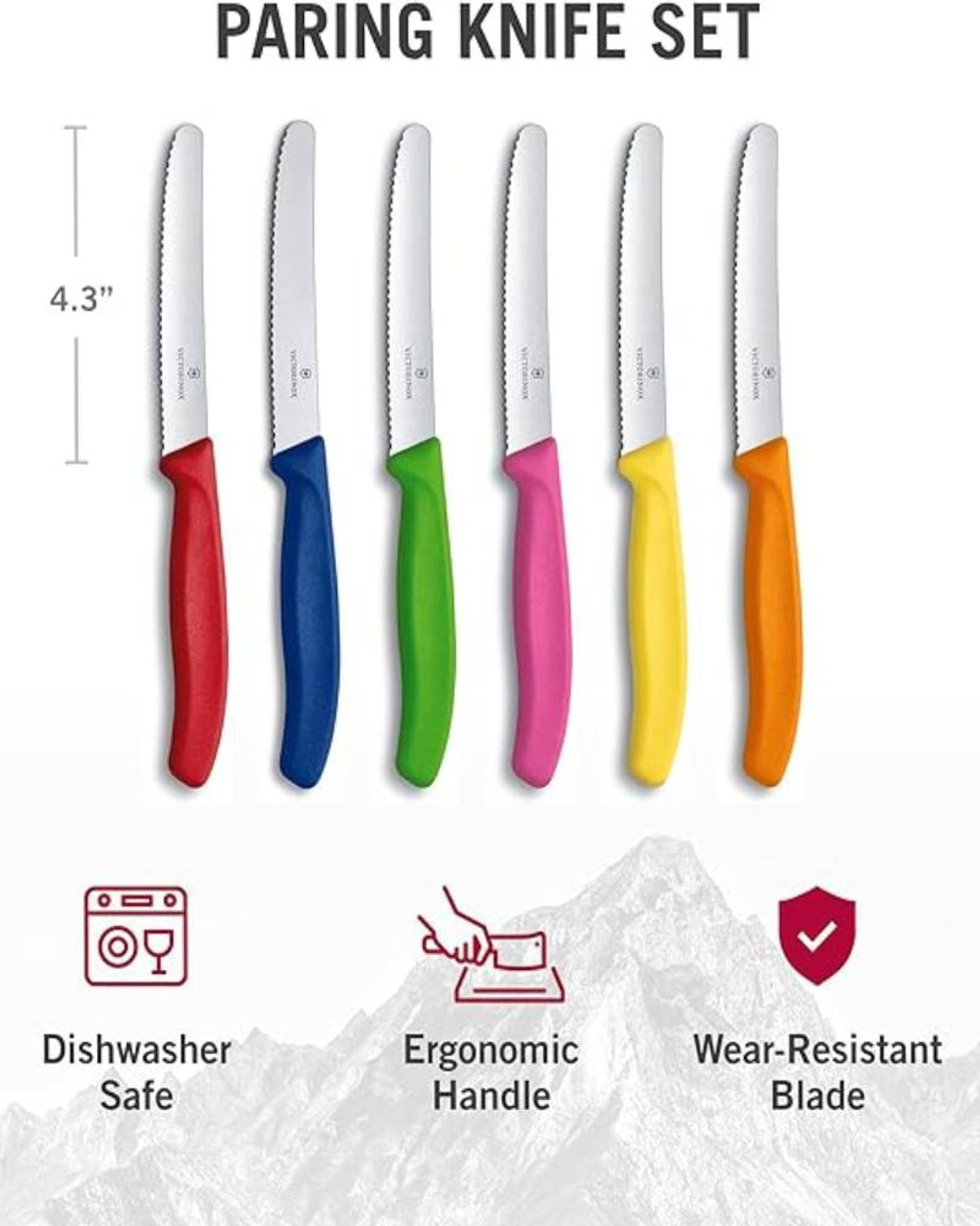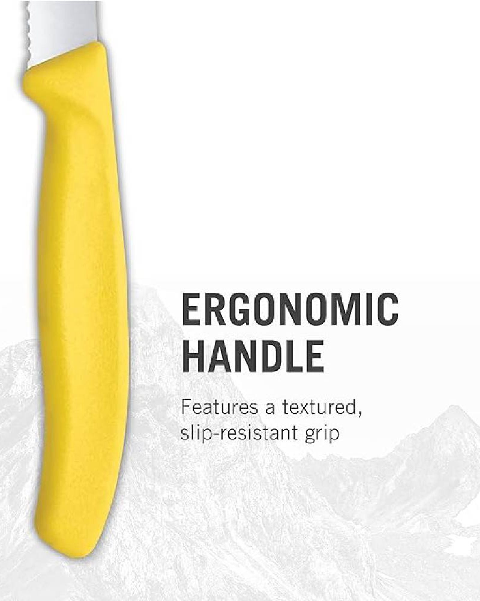 Bring color and function to the table with our tidy Swiss Classic Tomato and Table Knife. Each of the six pieces in this set of table knives has an ultra-sharp wavy edge designed for smoothly cutting through steak and pizza. And with its ergonomic handle and perfect size, you might even use it to cut everything else in the kitchen as well. Functional in purpose, but with a twist of fun in their juicy colorway of light green, blue, red, yellow, pink and orange, this set lifts the mood in any kitchen and at any table.