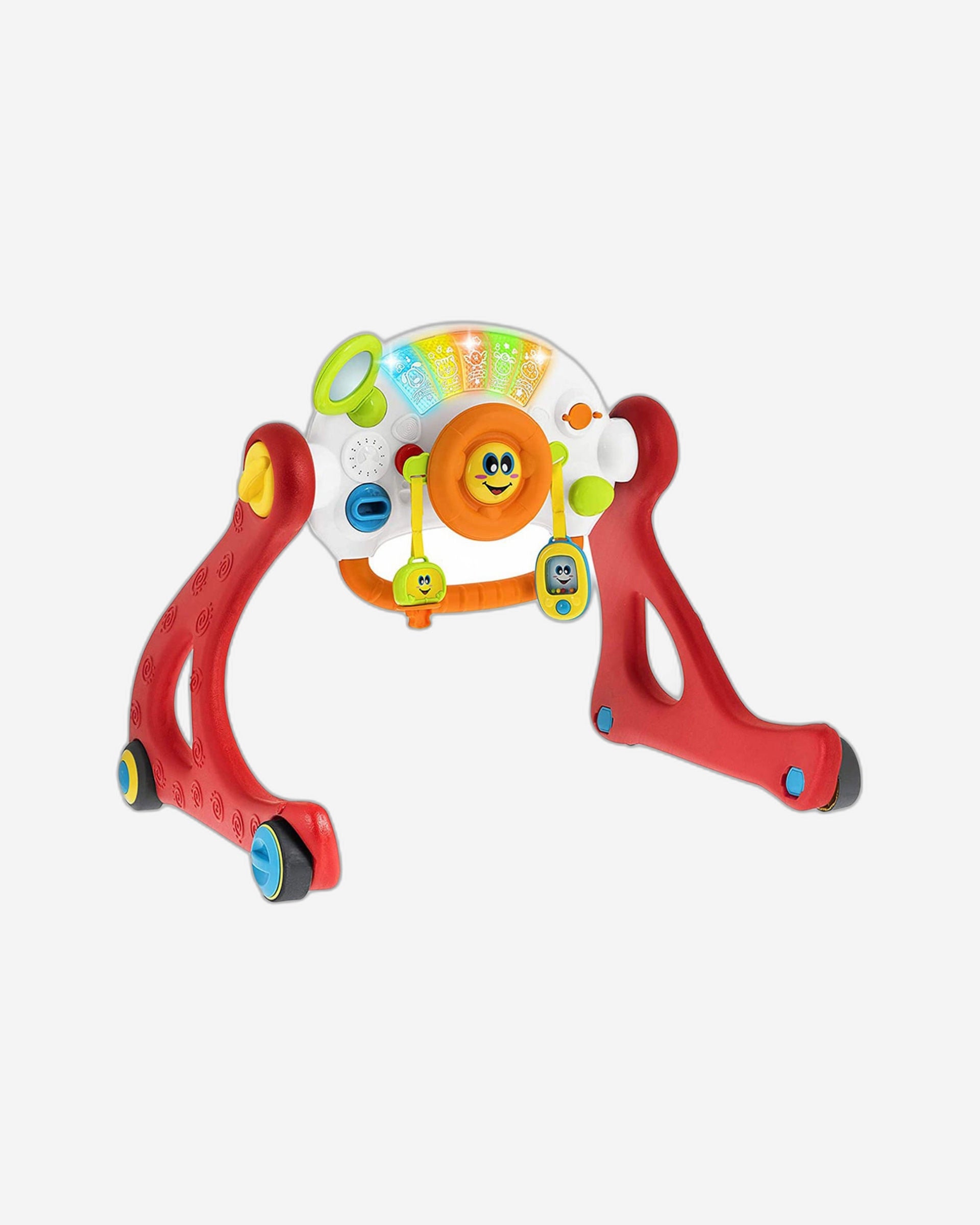 Rich activity center from 6-9 months. The Grow and Walk gym becomes an activity center with manual games, such as the nice ignition key, the steering wheel with horn, the gear level and the rearview mirror accompanied by sound effects and colored lights to entertain your child.