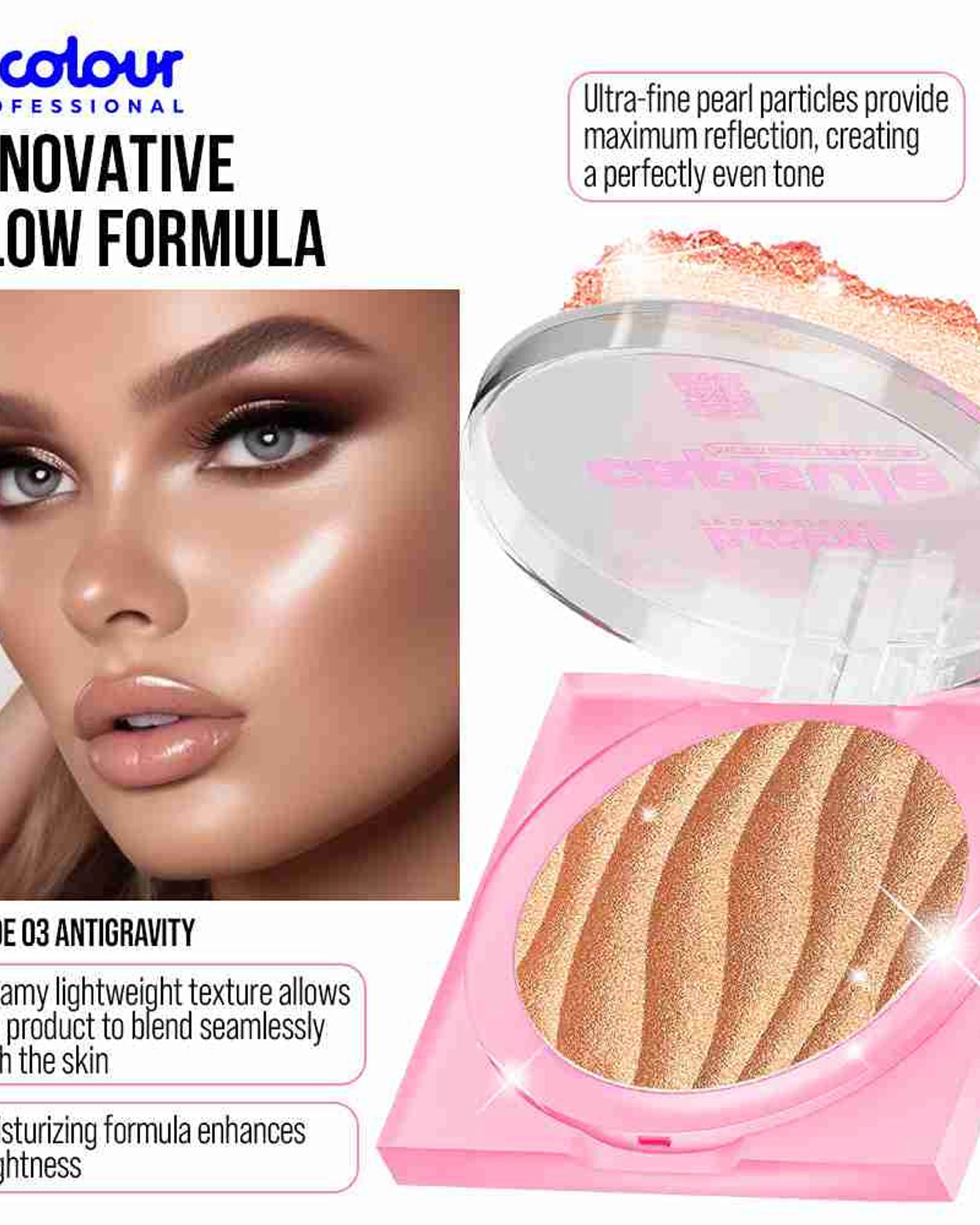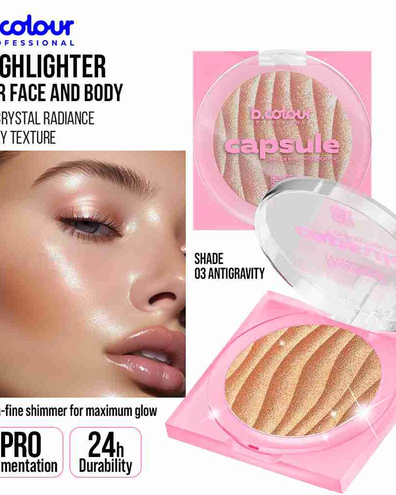 Achieve an instant 3D crystal radiance and a fresh, glowing complexion with the B.COLOUR PROFESSIONAL Highlighter 03 Antigravity. This professional-grade face and body highlighter features a lightweight, creamy texture that blends effortlessly into the skin, delivering a cool holographic tone that suits all skin tones.