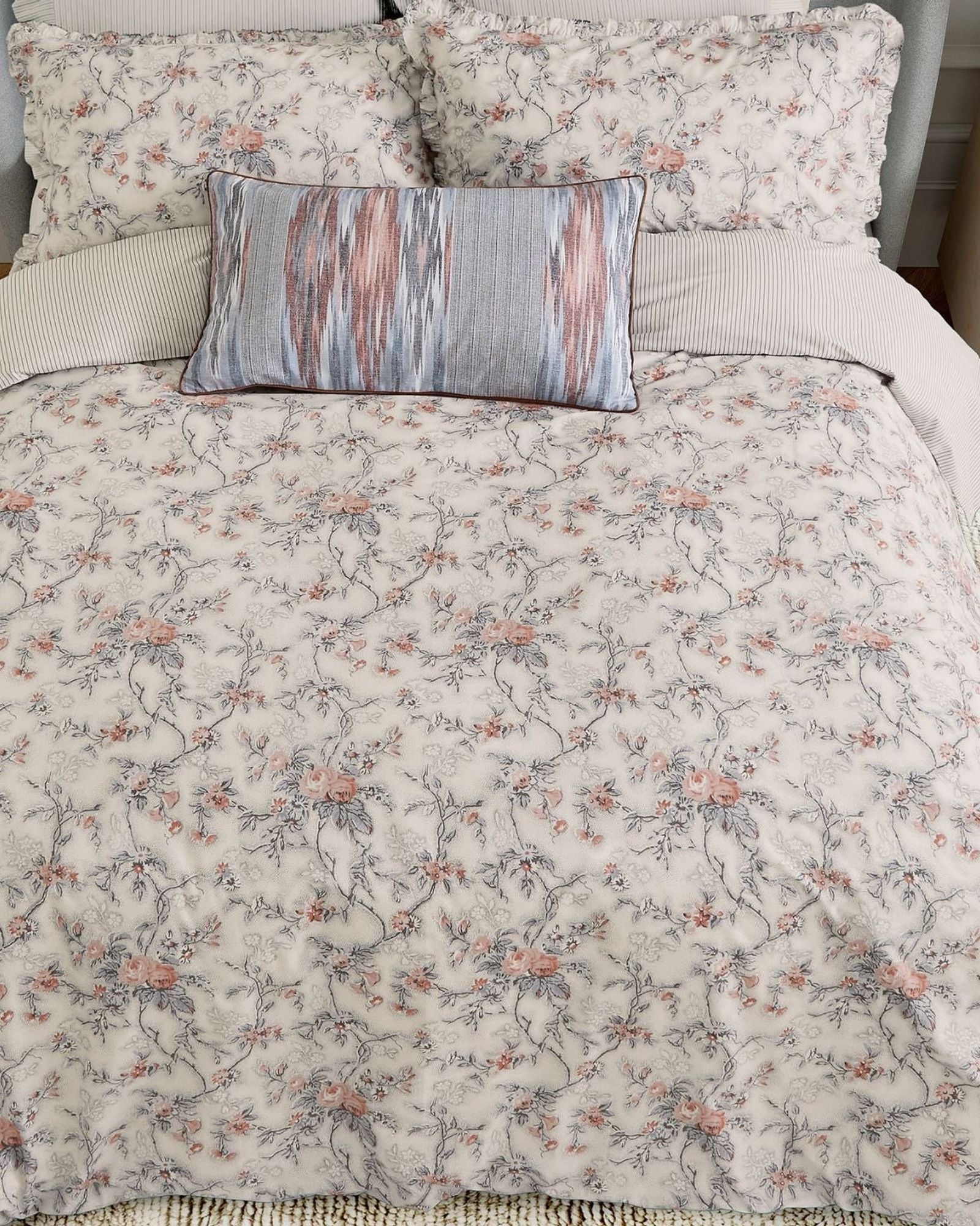 The Estelle bedding set features a sophisticated vintage-inspired floral trail design, crafted with meticulous detail. It includes an oxford pillowcase with frill edging for a feminine touch, all made from 100% cotton percale in a charming chambray and pink colorway.