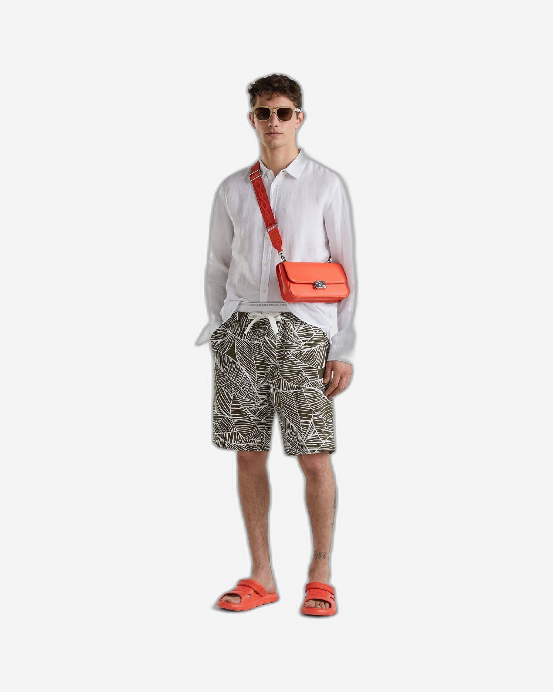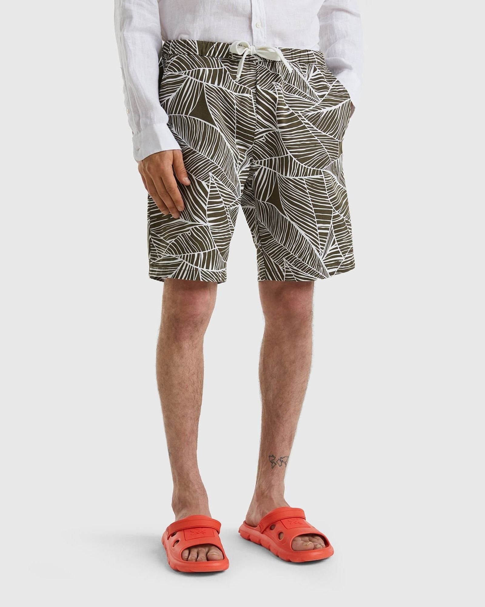 Shorts in pure cotton, with inner elastic waistband and drawstring. Pockets inserted at the sides and small patch pocket on the back. Allover tropical print with vacation spirit.