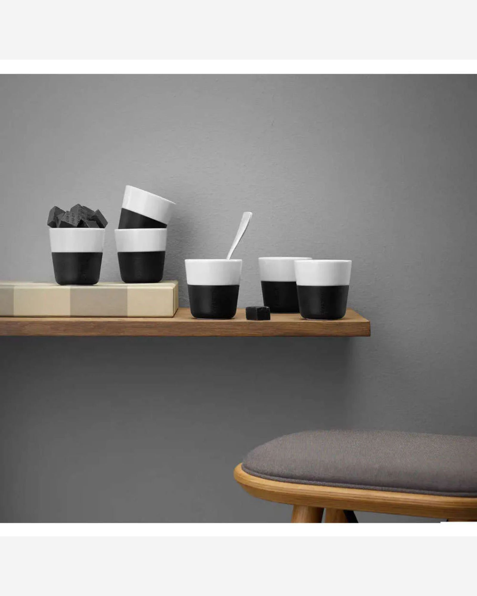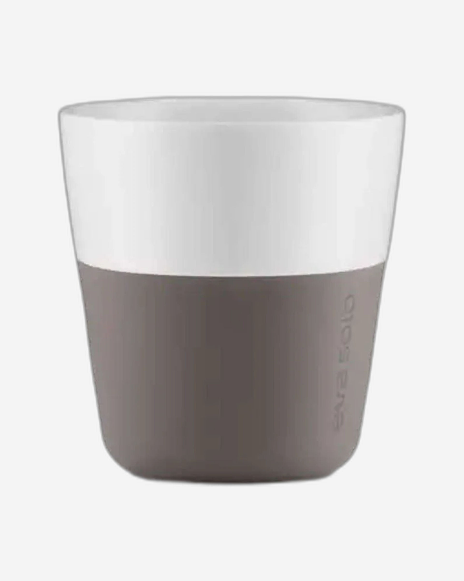 A pair of stylish, elephant?grey porcelain cups each fitted with a silicone sleeve. With a capacity of about 230ml, they match the standard lungo setting on many capsule coffee machines. The silicone sleeve helps with grip and protects fingers from heat. Dishwasher?safe (with care) and designed in classic Scandinavian style.
