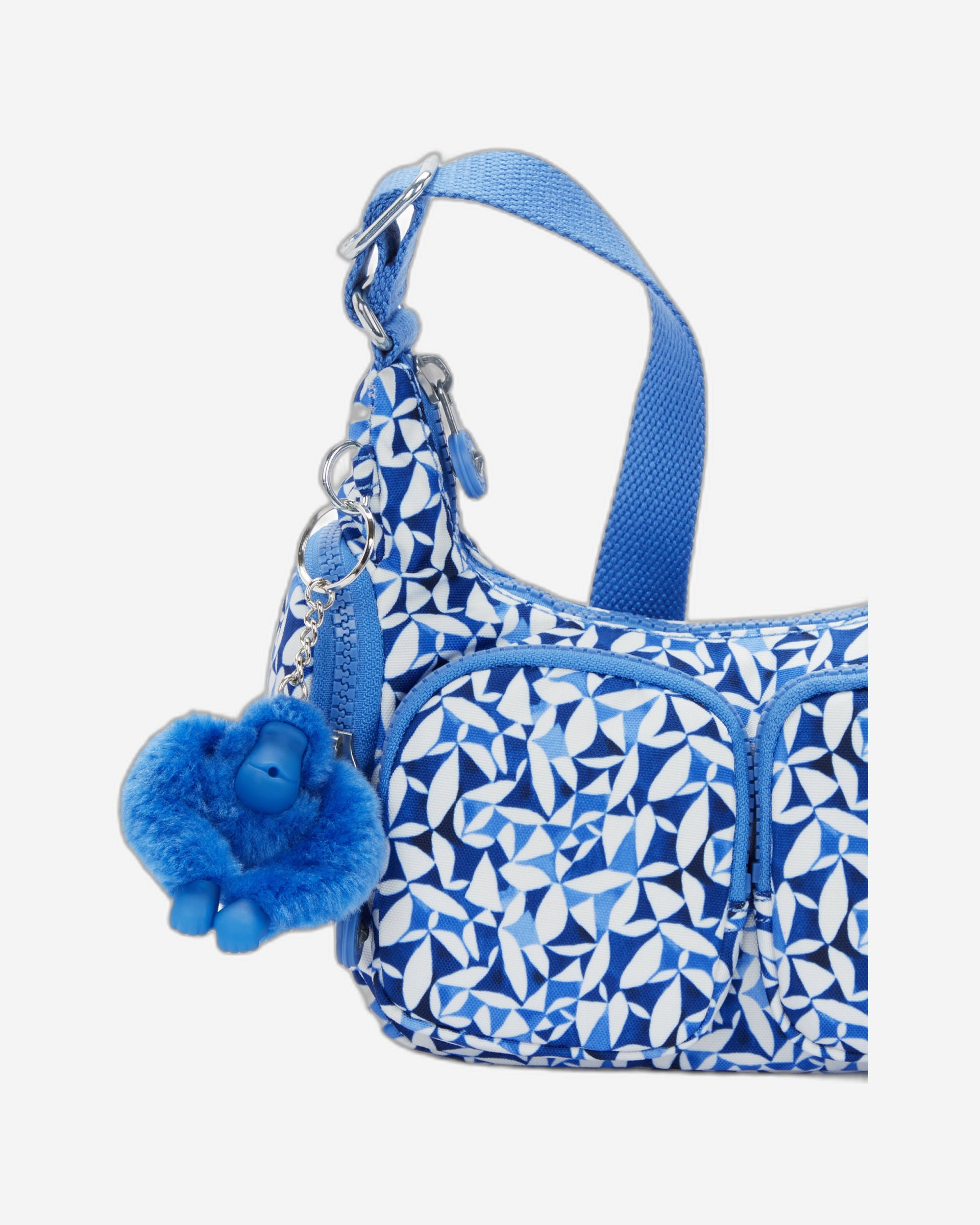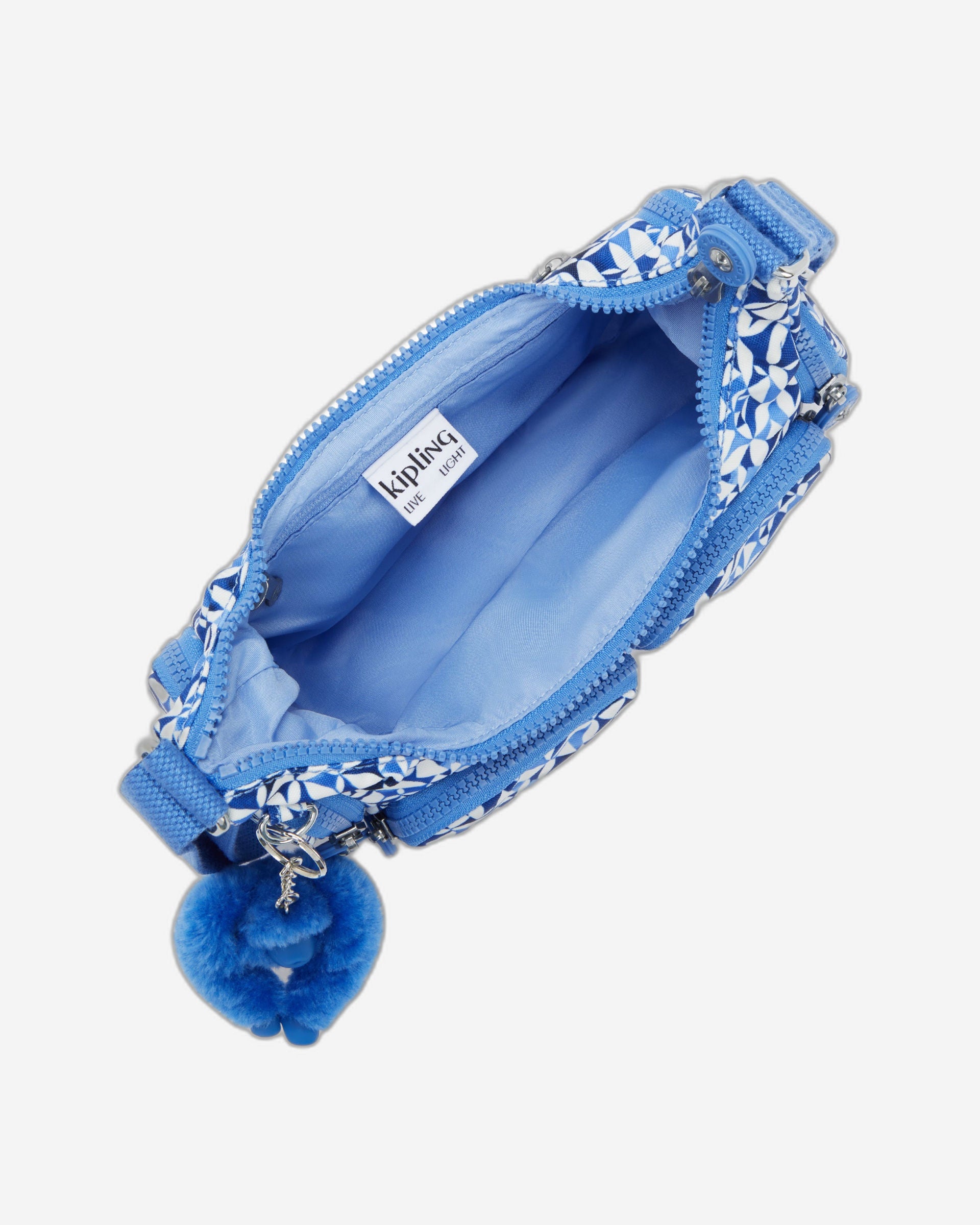 | Main compartment with zipped closure 1 zipped inside pocket 2 zipped front pockets 1 zipped back pocket 2 zipped side pockets Round Kipling logo Kipling monkey keychain |