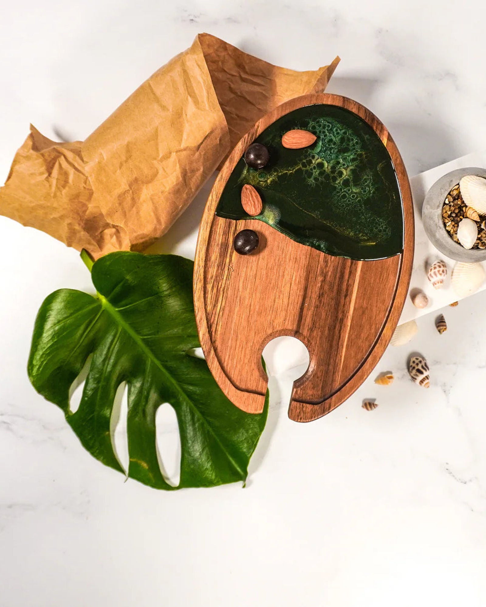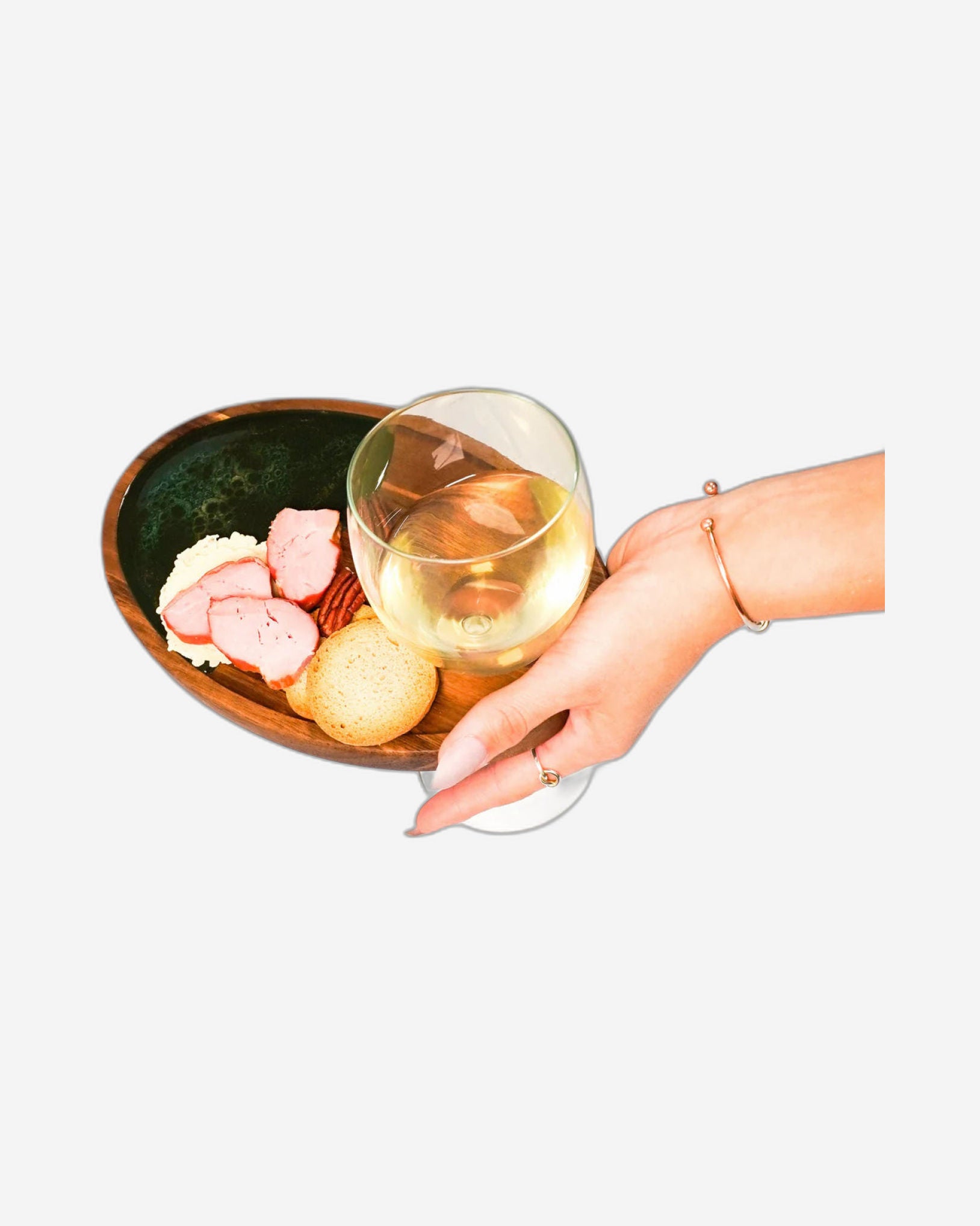 Our all-in-one wine & appetizer trays make it easy for you to host, and visit, in style. These unique pieces blend gorgeous Acacia hardwood and an eco-friendly resin to create a one-of-a-kind tray that will impress your guests. Your glass of wine conveniently fits in its own recessed space and the rim around the entire tray keeps all your food in place. These individual appetizer trays are perfect for stand-up receptions and parties of all kinds.