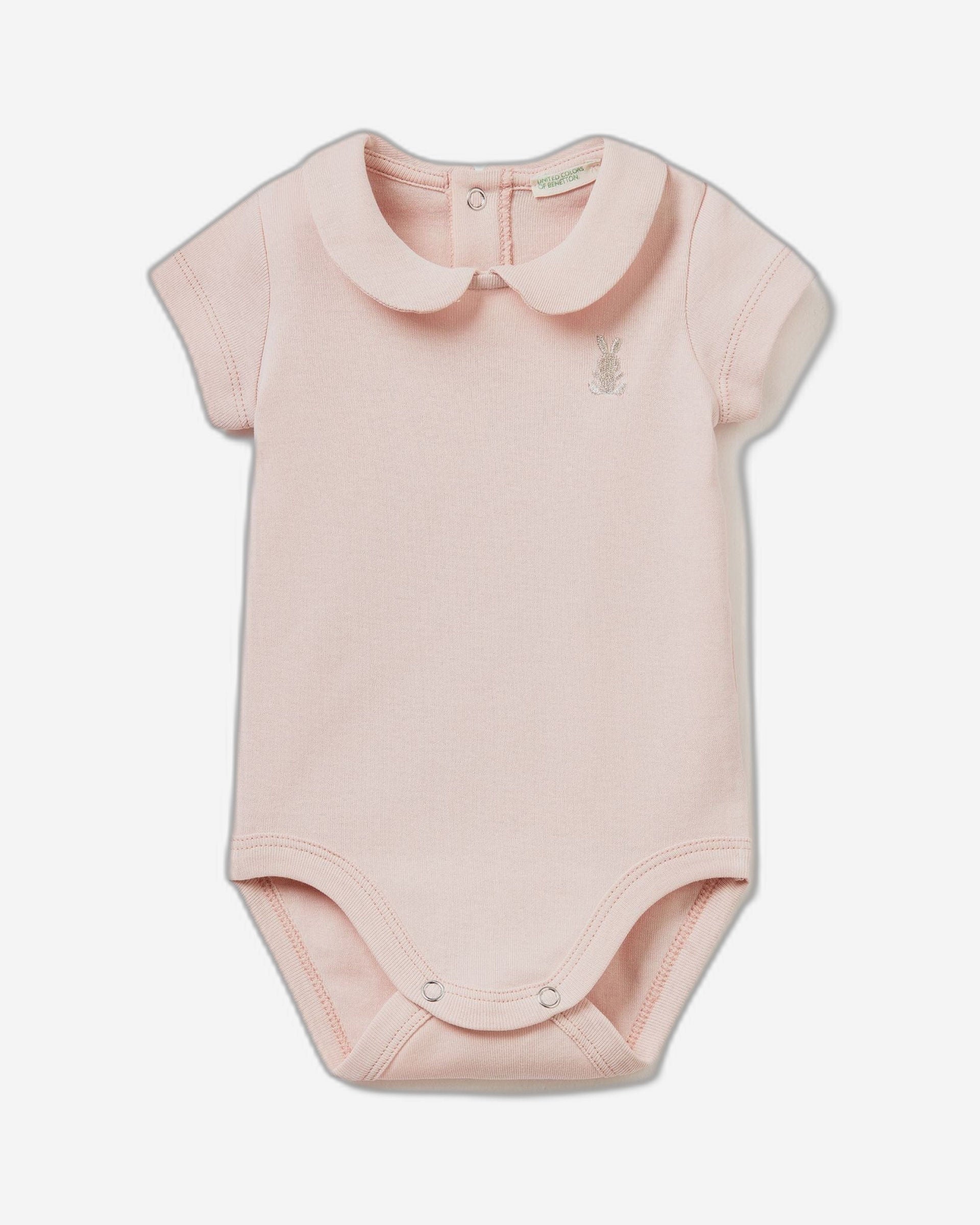 Onesie in ribbed pure organic cotton. Refined round collar and bunny logo embroidered at left breast. Practical partial opening on back and on crotch with snap buttons. Comfy and refined.