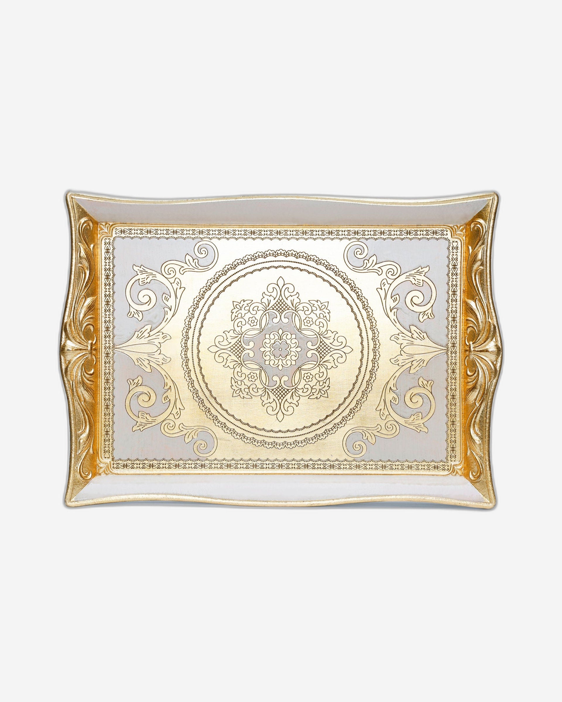The Sezzatini Large Rectangular Tray Elisei Oro/Avorio showcases the timeless beauty of Florentine decorative art, featuring intricate gold embellishments and an elegant Oro/Avorio (Gold and Ivory) finish. Handcrafted from fine wood using traditional and modern techniques, it combines classic Italian craftsmanship with a touch of modern luxury. This versatile tray makes a stunning centerpiece or serving display, adding sophistication and charm to any home setting.