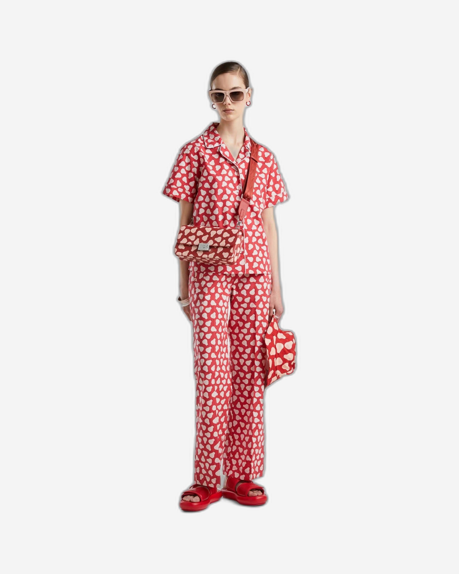 Short sleeve shirt in pure lightweight cotton. Lapel neckline with rounded tips, front buttoning and patch pockets on the bottom. Pink pear print on a red background all over the garment. Pop style with a passion for fruit, for modern looks that are full of personality.