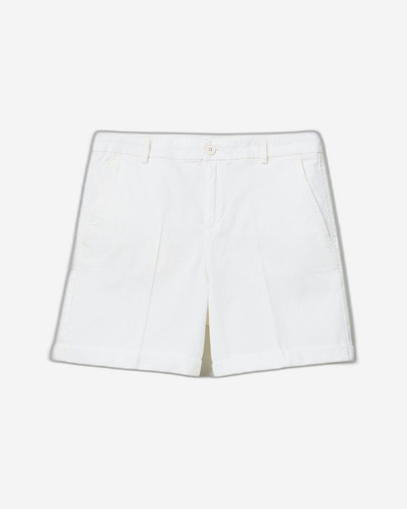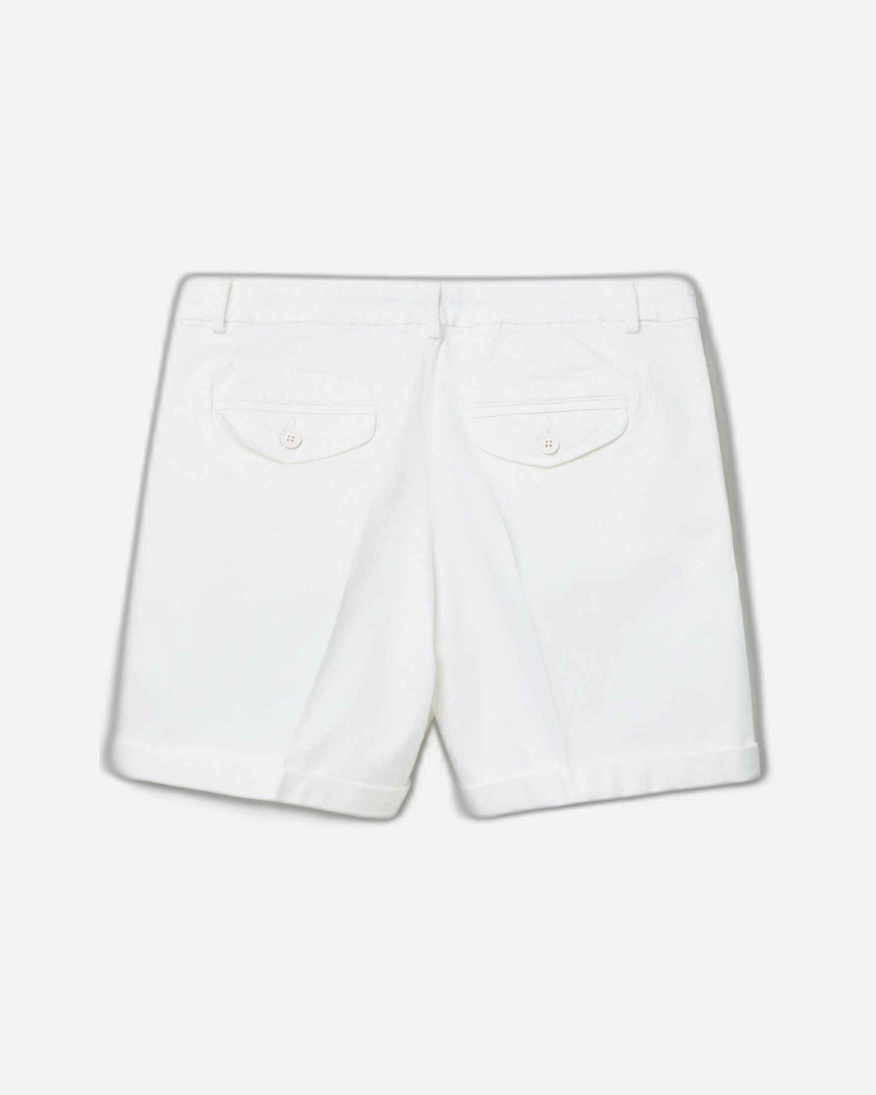 Shorts in stretch cotton Front pockets, back with pleats and pockets with button, fixed turn-up at the bottom. Feminine style. Perfect for warmer days.